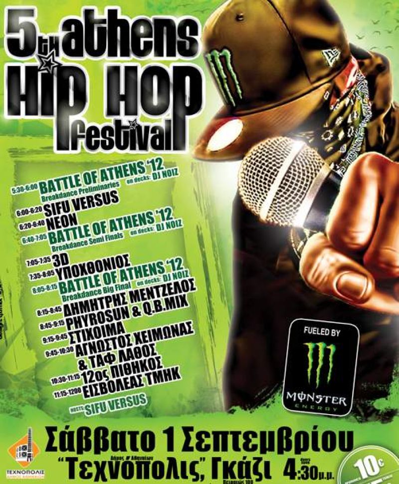 Το 5th Athens Hip Hop Festival προθερμαίνεται και ετοιμάζεται για τη μεγάλη γιορτή του ελληνικού Χιπ Χοπ. Ο σαρωτικός 12ος Πίθηκος, ο μπαρουτοκαπνισμένος Εισβολέας, ο παντός καιρού Άγνωστος Χειμώνας με το “ριμοπυροβόλο” Ταφ Λάθος, οι χωρίς αντίπαλο Στίχοιμα, ο “Παίζει Πρόβλημα” Phyrosun, ο “προπάτορας” Δημήτρης Μεντζέλος των Ημισκουμπρίων, ο “πιστολέρο” Υποχθόνιος, ο πολυδιάστατος 3D, o ανανεωμένος Neon, o άρχοντας του stage Sifu Versus και η απρόβλεπτη Ju Ju θα συναντηθούν στη σκηνή του 5th Athens Hip Hop Festival για να ραπάρουν, να παλέψουν με την αλήθειά τους και να κερδίσουν τη θέση τους σε μια Αθήνα που ανασυντίθεται, επαναπροσδιορίζοντας τους μουσικούς χάρτες και τις εκφράσεις της χωρίς στεγανά και σκοπιμότητες.