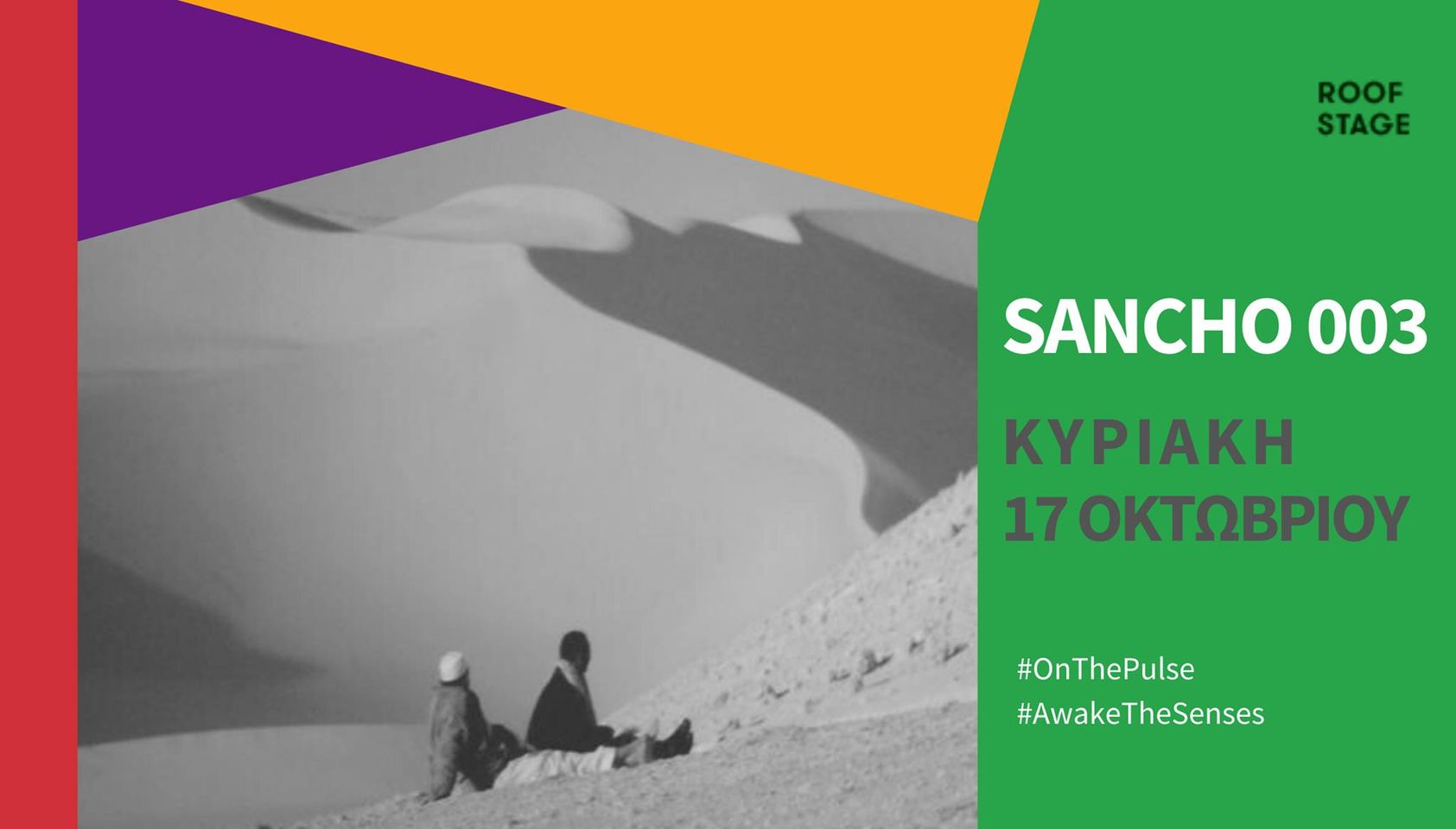 Οι SANCHO 003, το γνωστό ντουέτο της εγχώριας experimental σκηνής, των Κώστα Παντέλη και Φώτη Σιώτα, ανεβαίνουν για πρώτη φορά στην ταράστα του Gazarte την Κυριακή 17 Οκτωβρίου για ένα ιδιαίτερο live με ένα set list αναφορά στη δισκογραφία τους αλλά και με ακυκλοφόρητο υλικό που θα παρουσιαστεί για πρώτη φορά στην Αθήνα. Οι Sancho 003 παράγουν ηλεκτρο-ακουστικά ηχοτοπία χρησιμοποιώντας τη τεχνική του looping σε όλες τους τις συνθέσεις, που είναι αποκλειστικά οργανικές .