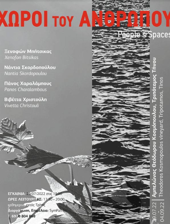 Η εικαστική έκθεση «Χώροι του Ανθρώπου» εντάσσεται στο Φεστιβάλ Τήνου 2022 Ο τίτλος είναι δανεισμένος από το ομώνυμο έργο του Κορνήλιου Καστοριάδη. Συμμετέχουν οι καλλιτέχνες: Ξενοφών Μπήτσικας, Νάντια Σκορδοπούλου, Πάνος Χαραλάμπους και Βιβέττα Χριστούλη