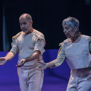 Στις πλάτες της ομάδας, φορτώνεται ένα τεράστιο υφασμάτινο μοβ τόπι που μόλις περαστεί σε επικλινείς σιδερένιους άξονες, ξεδιπλώνεται για να σχηματίσει ένα πένθιμο τοπίο. Η σκηνογραφία της Κλειώς Μπομπότη – αυτός ο πολύ μεγάλος ομοιόμορφος μοβ κενός χώρος – έχει στόχο να αφήσει «στη φαντασία του θεατή να συμπληρώσει τα κενά και να τονίζει τόσο το μικρό μέγεθος του ανθρώπου όσο και την παραμικρή του χειρονομία».