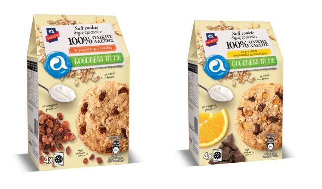 Δύο μοναδικές γεύσεις Aλλατίνη Goodness in Me Soft Cookie: με γιαούρτι και σταφίδες και με γιαούρτι, πορτοκάλι και σοκολάτα!