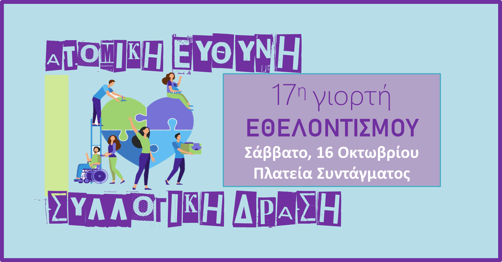 40 περίπου εθελοντικοί οργανισμοί με τους εκατοντάδες εθελοντές τους μας προσκαλούν για 17η χρονιά σε μια ανοιχτή γιορτή για τον Εθελοντισμό και την ανιδιοτελή προσφορά στην κοινωνία και τον άνθρωπο: το Σάββατο, 16 Οκτωβρίου 2021 στην Πλατεία Συντάγματος. Κατά την ημερίδα πραγματοποιείται έκθεση δράσεων των συμμετεχόντων φορέων, ενημερωτικές παρουσιάσεις, δραστηριότητες για παιδιά, μουσικά/χορευτικά δρώμενα, κοινωνικές δράσεις για τη στήριξη ευπαθών ομάδων της πόλης μας.