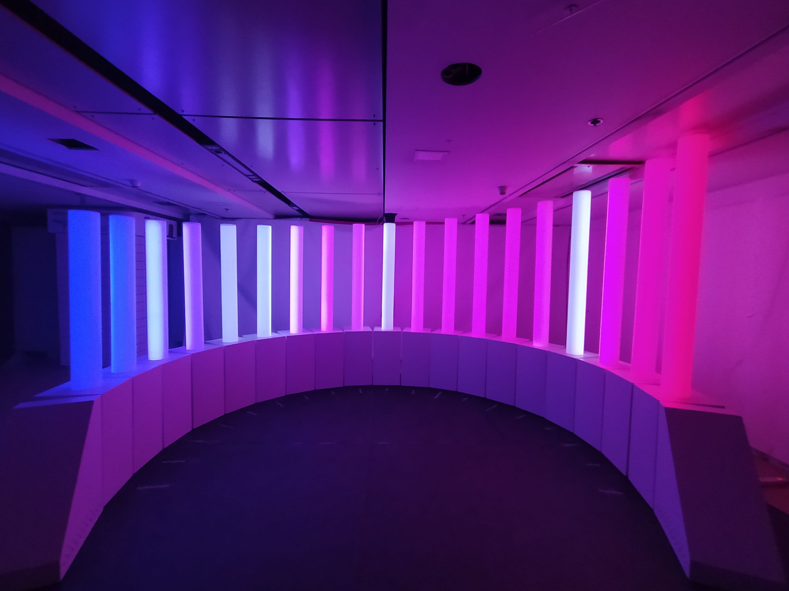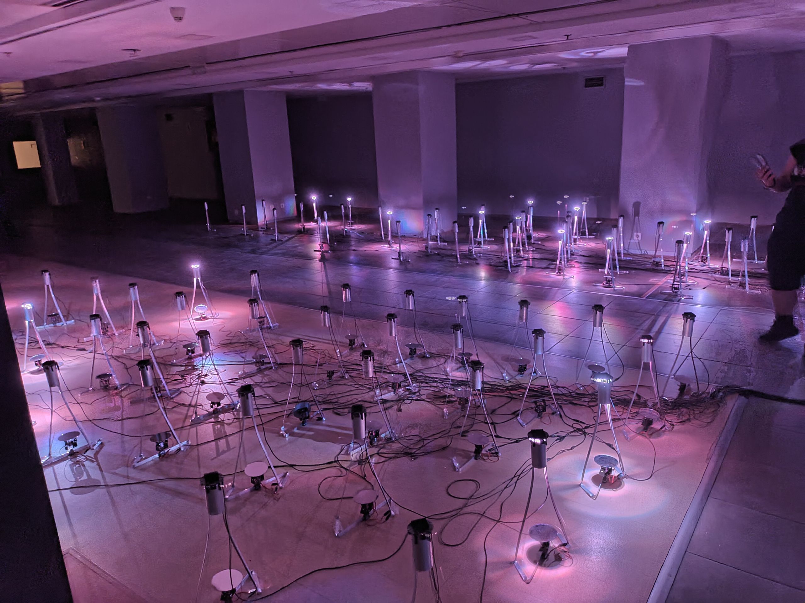 Στον ίδιο όροφο και λίγο πριν συναντήσεις το παραπάνω έργο, θα βρεθείς σε μία σκοτεινή αίθουσα γεμάτη ρομποτάκια-φωτιστικά. Πριν προλάβεις να αναρωτηθείς γιατί υπάρχει προειδοποίηση για έντονα φώτα, αφού η αίθουσα είναι σχεδόν ολοσκότεινη, τα φώτα ξεκινούν τον δικό τους “χορό”. Σύμφωνα με τον Γερμανό καλλιτέχνη του έργου, Lukas Truniger, η εγκατάσταση ενσαρκώνει ψηφιακές αναπαραστάσεις περίπλοκων συστημάτων μέσα από εκατοντάδες διαδραστικά αντικείμενα και επικοινωνία μέσω του φωτός. Ουσιαστικά, βλέπουμε να ζωντανεύει μπροστά μας ένα ψευδο-κοινωνικό περιβάλλον αλληλεπίδρασης των ρομποτικών αντικειμένων, τα οποία είναι ταυτόχρονα διαχωρισμένα άτομα, αλλά και συλλογικό σώμα. Αυτή ήταν μία εμβυθιστική, κινητική εγκατάσταση που σίγουρα μάς τράβηξε την προσοχή.