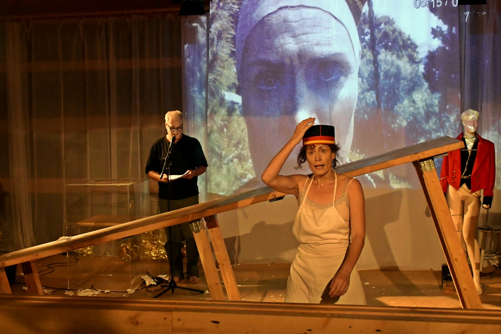 Στιγμιότυπο από την παράσταση “Συνάντησέ με στην έξοδο” στην οποία η Ειρήνη Δράκου υπογράφει το κείμενο και τη σκηνοθεσία