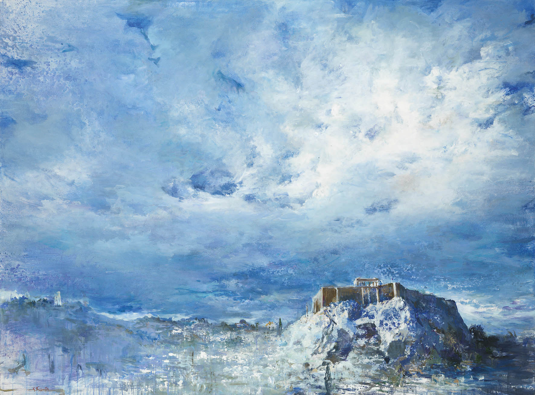 Στάση αναστοχασμούΠίνακες φιλοτεχνημένοι από το 2019 και καθ’ όλη τη διάρκεια της πανδημίας και του συναφούς εγκλεισμού, αντιπροσωπεύουν μια στάση στη μέση της διαδρομής· μια στάση αναστοχασμού, μια διακοπή που προοιωνίζεται την επανεκκίνηση. Ο εγκλεισμός ήταν μια τέτοια διακοπή για τον καλλιτέχνη, όπως και για τους περισσότερους. Στη ζωγραφική διαδρομή του όμως προηγείται ένα άλλο «μέσον», ένα άλλο «κέντρο», και αυτό δεν είναι άλλο από την επίσκεψη που πραγματοποίησε, λίγες μέρες πριν το ξέσπασμα της πανδημίας και στη χώρα μας, στους Αγίους Τόπους.