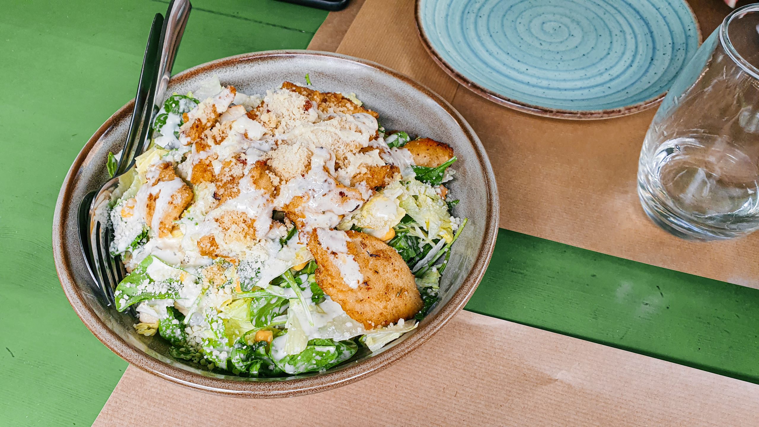 Το καλοκαιρινό μενού ανοίγει μία δροσερή Ceasar’s Σαλάτα με πράσινα φυλλώδη λαχανικά, άισμπεργκ, καλαμπόκι, κρουτόνς, παρμεζάνα, ceasar’s dressing και vegan γύρο κοτόπουλο, που, πραγματικά, δεν έχει να ζηλέψει τίποτα από μία κλασσική, κρεοφαγική Ceasar’s. Προσωπικά, αν δεν ήξερα ότι ο γύρος κοτόπουλο είναι vegan, δεν θα το καταλάβαινα ποτέ, καθώς τόσο η υφή, όσο και η γεύση του προσομοίαζαν απίστευτα σε εκείνες του κοτόπουλου. Ένα πολύ δροσερό πιάτο, γεμάτο με αρώματα Μεσογείου, το οποίο προτείνουμε ανεπιφύλαχτα.