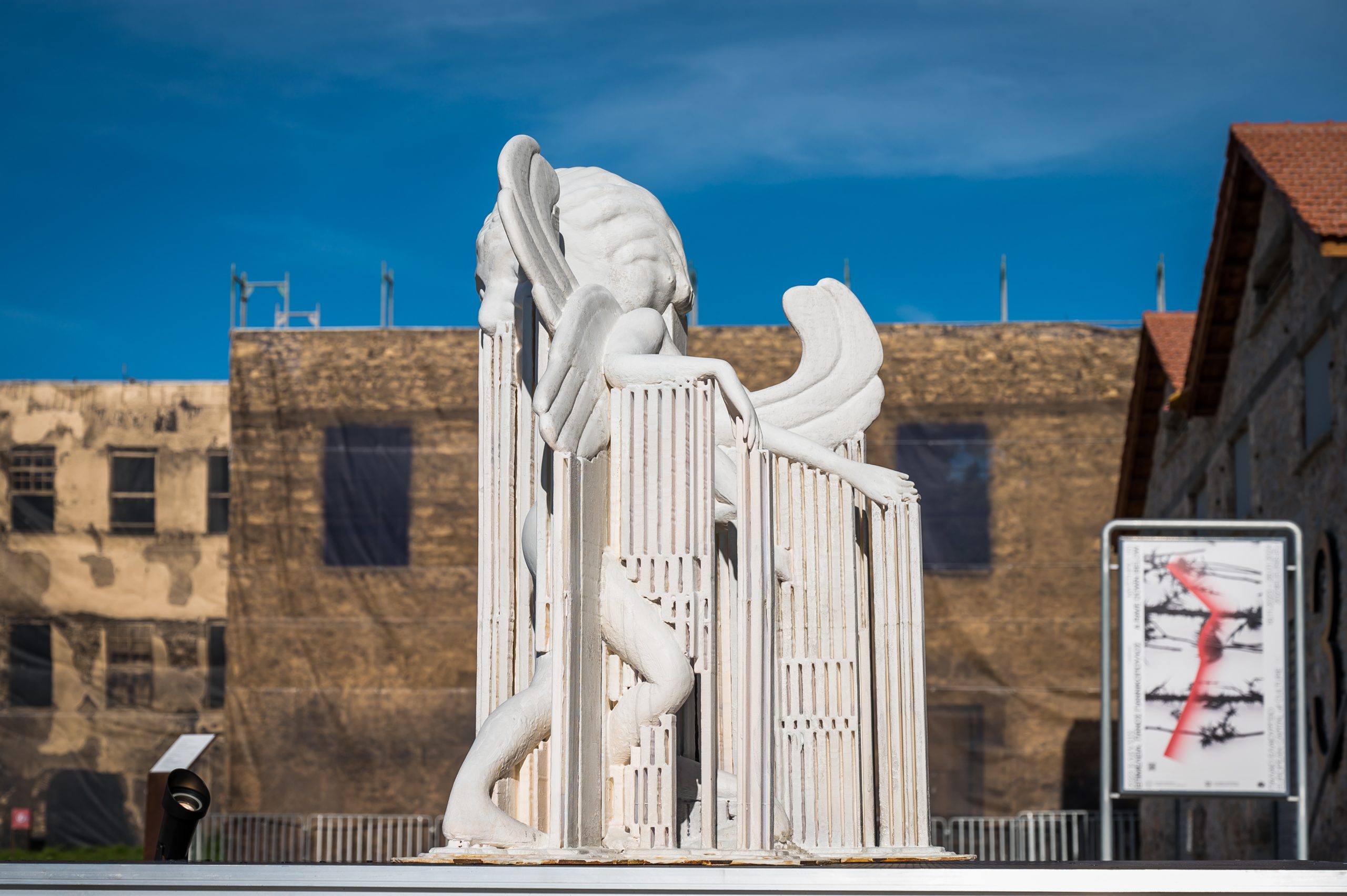 «Φύλακας» στην είσοδο της έκθεσης, όπως εκείνοι που λειτουργούσαν σαν επίφοβοι «πορτιέρηδες» στα μυστικά ρέιβ πάρτυ, ένα αποτροπαϊκό γοργόνειο, φτιαγμένο από τον Θεόδωρο Γιαννάκη, με τίτλο «Gorgoneion Complex Winged – no face no morph aka Hysteria Recline» (2023). Δύο γυμνά σώματα με φτερά, που θυμίζουν τις χθόνιες δυνάμεις των Ερινύων, ενωμένα σε ένα καταλήγουν στην κεφαλή της Γοργόνας, σε ένα σύμπλεγμα που ο καλλιτέχνης επεξεργάστηκε χάρη σε τεχνολογίες ΑΙ και 3D εκτυπώσεων.