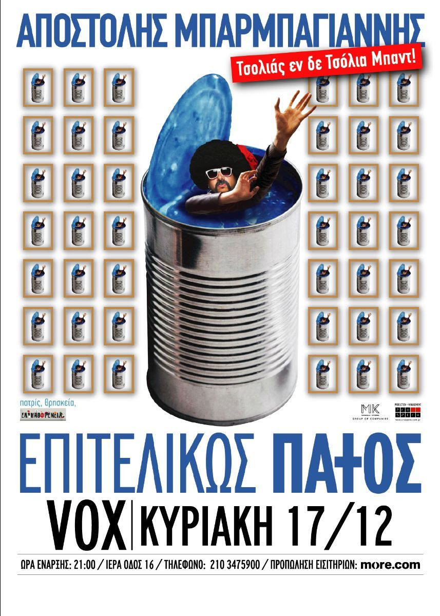Ο Αποστόλης Μπαρμπαγιάννης έρχεται με την νέα του παράσταση, το stand up comedy show με τίτλο “Επιτελικώς Πάτος”, την Κυριακή 17 Δεκεμβρίου, στο VOX, με ζωντανή ορχήστρα.