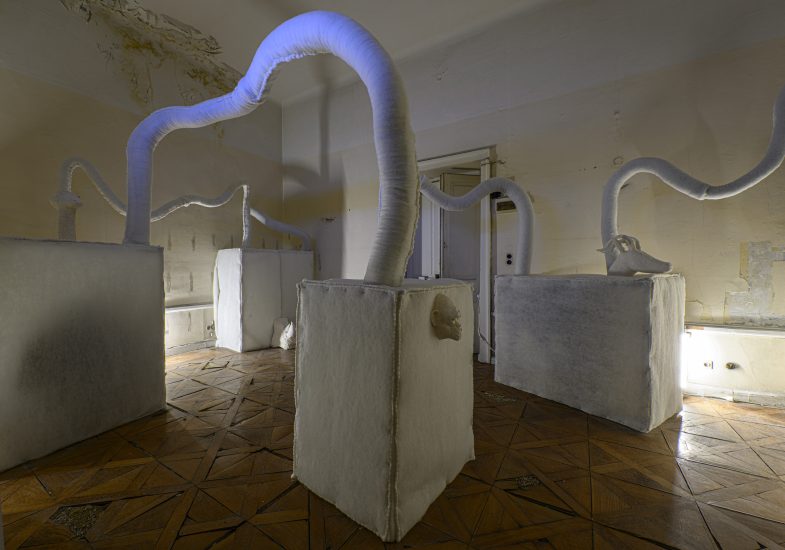 Συγκεχυμένα θραύσματα μνήμης συναντάμε και στην εγκατάσταση Sonatina 2084 (2024) της Κλειούς Γκιζελή. Ένα παράξενο όνειρο, η ελληνική επαρχία, ένα ταξίδι στο φεγγάρι και το παλιό κτήριο συνάμα συνθέτουν έναν μονόλογο ενός επίσης ιδιαίτερου πλάσματος που δεν ξέρουμε από τι έχει επιβιώσει.