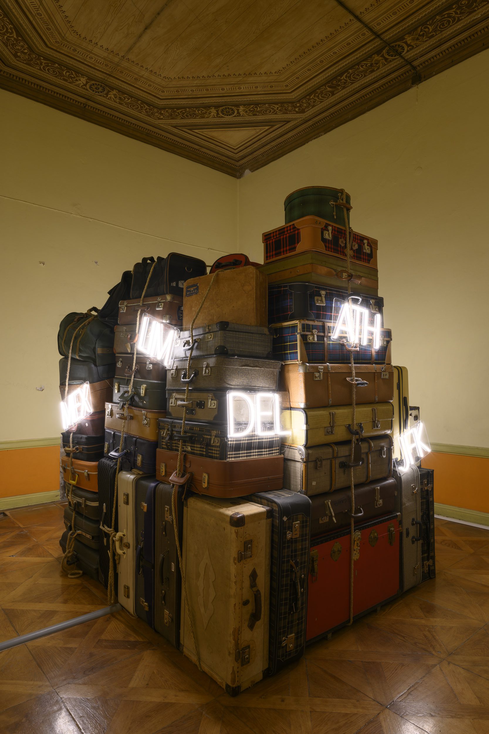 Ένα βουνό από βαλίτσες με ταμπέλες από διάφορες πόλεις του κόσμου αντικρίζουμε στο έργο Check-in της Κλαίρης Τσαλουχίδη-Χατζημηνά (2024), που μιλά για την αέναη αναζήτηση, κυρίως εσωτερική, του ταξιδευτή.