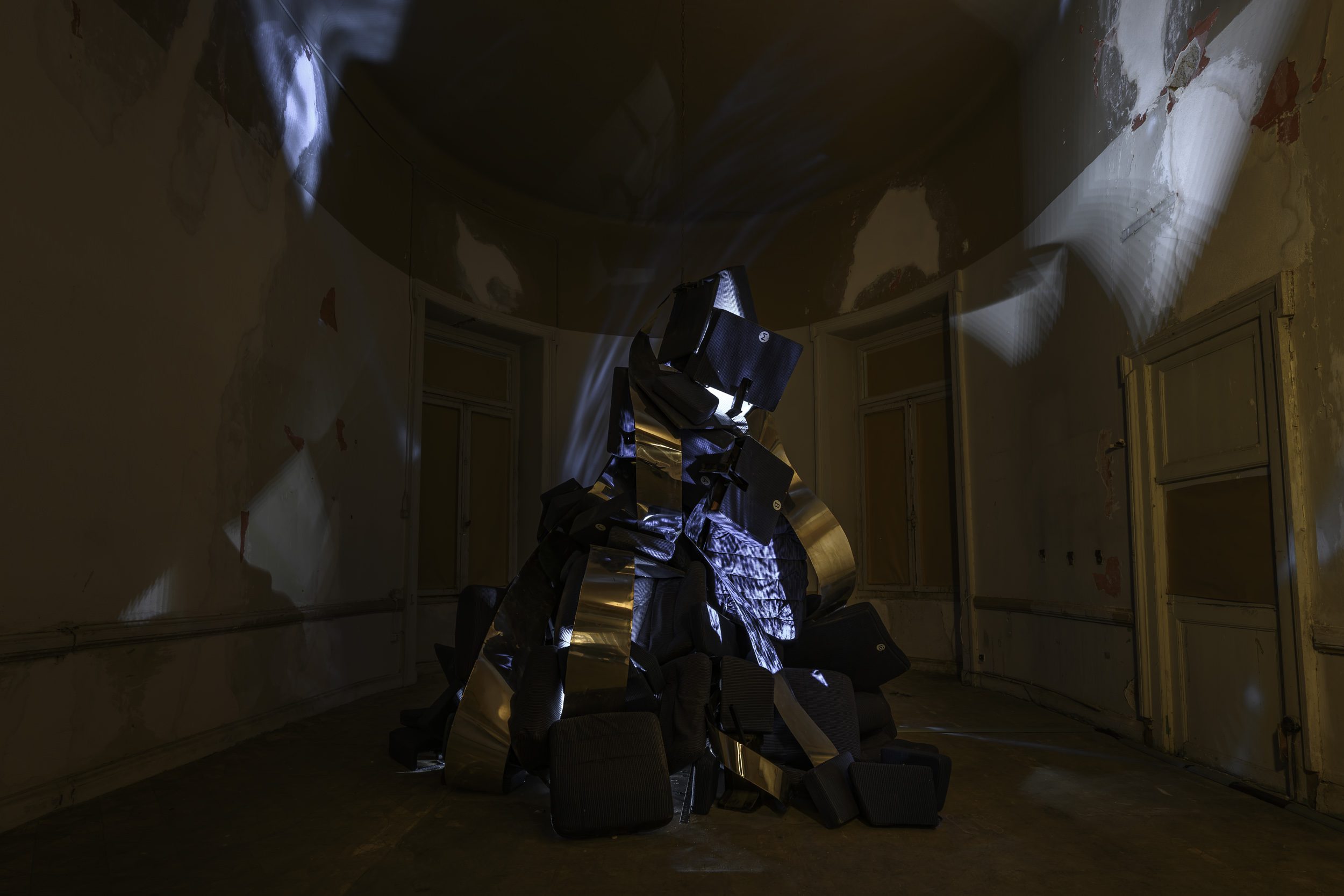 Μοιάζει ας πούμε κάπως γκροτέσκο να πρέπει να διαχειριστούμε μια τόσο πρόσφατη μνήμη, όπως οι βραδιές μας στο Ιντεάλ και οι κουβέντες μετά από κάθε προβολή, όπως επιχειρεί το Μνημείο Ψιθύρων (2024) της Μαριάννας Στραπατσάκη, ένα τοτέμ από αποσυναρμολογημένα καθίσματα του κινηματογράφου που αφηγούνται ιστορίες.