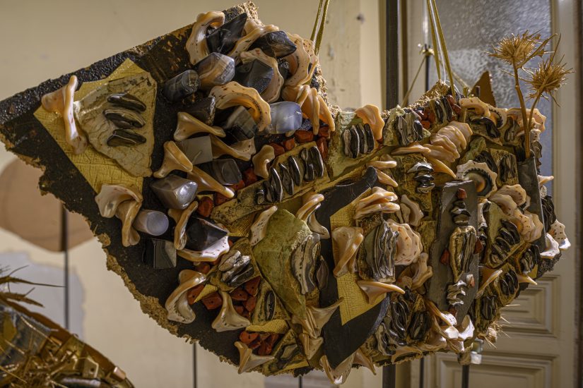 Η περίπλοκη κατασκευή της Άννας Αντάρτη, Manuport (2024) είναι μια σύνθεση ακατέργαστων φυσικών υλικών με ανθρώπινα αντικείμενα κι εργαλεία, όλα αριθμημένα με σημειωμένο τον τόπο προέλευσής τους, όπως δηλαδή στην ανασκαφική διαδικασία, σε μια αλληλεπίδραση μεταξύ παρελθόντος και παρόντος, φύσης και ανθρωπότητας.