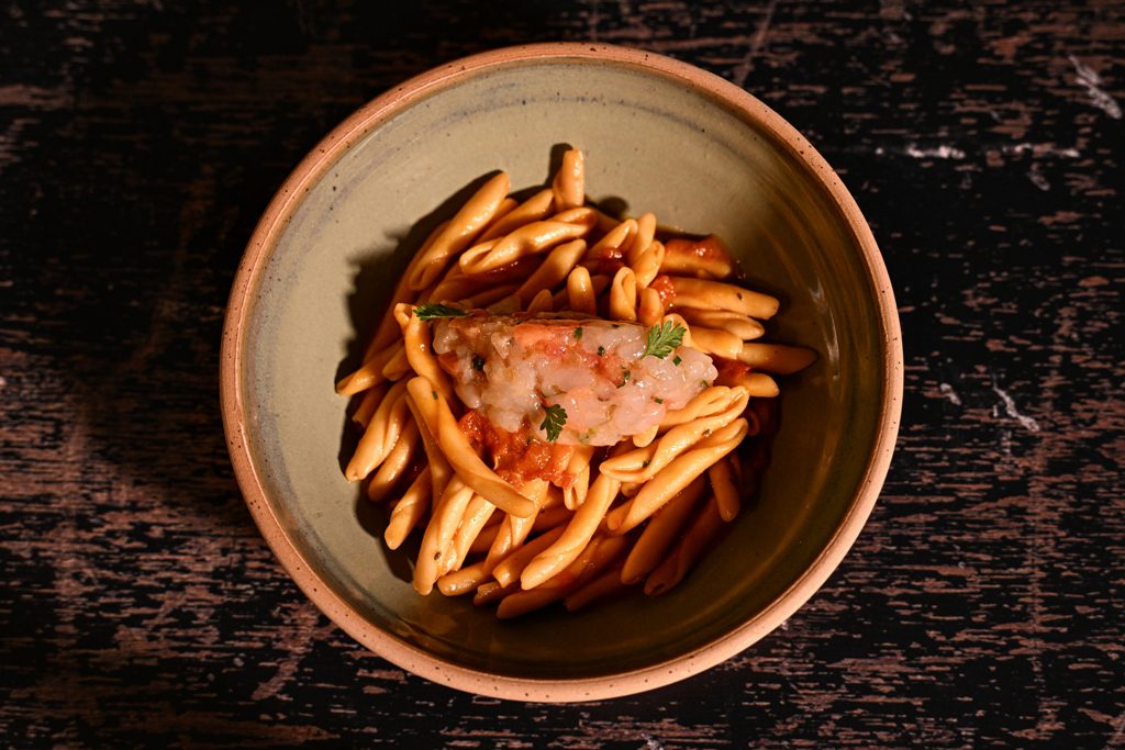 Σκιουφιχτά με Ταρτάρ & μπισκ Γαρίδας Πρέβεζας, τομάτα και εστραγκόν
