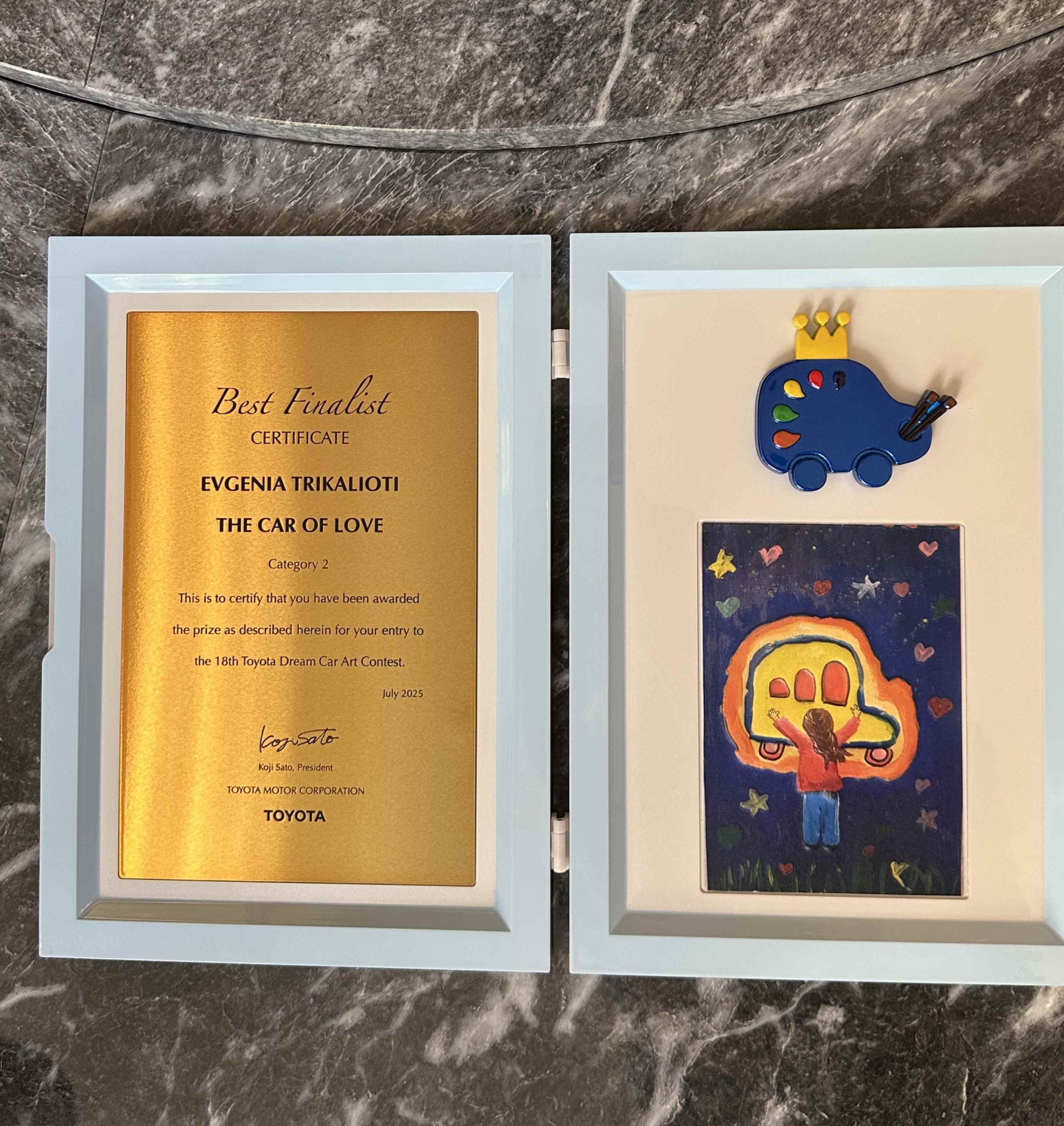 Η Toyota Hellas, με μεγάλη χαρά ανακοινώνει ότι η Ευγενία Τρικαλιώτη αναδείχθηκε μεταξύ των Best Finalists στον 18ο Παγκόσμιο Διαγωνισμό Ζωγραφικής Toyota Dream Car. Η συμμετοχή της Ευγενίας ξεχώρισε ανάμεσα σε 90 χώρες με το έργο της «Το αυτοκίνητο της αγάπης», σχεδιάζοντας ένα αυτοκίνητο που «ξεχειλίζει» από αγάπη και «τους χωράει όλους χωρίς να τους ξεχωρίζει».