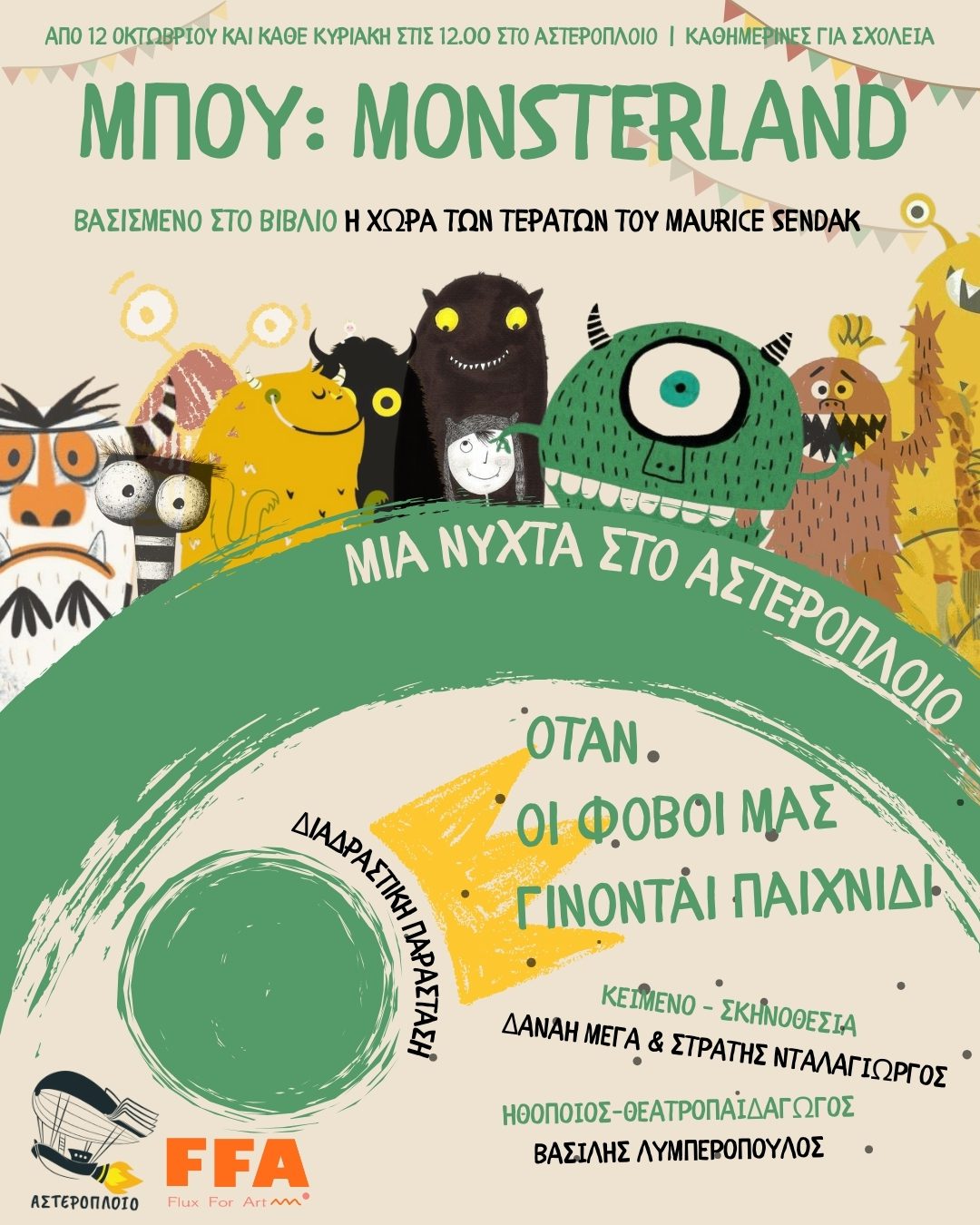 Η Δανάη Μέγα με την ομάδα Flux for Art σε συνεργασία με το Αστερόπλοιο παρουσιάζουν τη νέα διαδραστική παιδική παράσταση «Μπου! Monsterland: Μια νύχτα στο Αστερόπλοιο», εμπνευσμένη από το εμβληματικό βιβλίο του Maurice Sendak «Η Χώρα των Τεράτων». Από 12 Οκτωβρίου στον Αστερόπλοιο – Πολυχώρος Πολιτιστικής Έκφρασης και Παιδικού Βιβλιοπωλείου. *Για παιδιά 4 ετών και άνω.