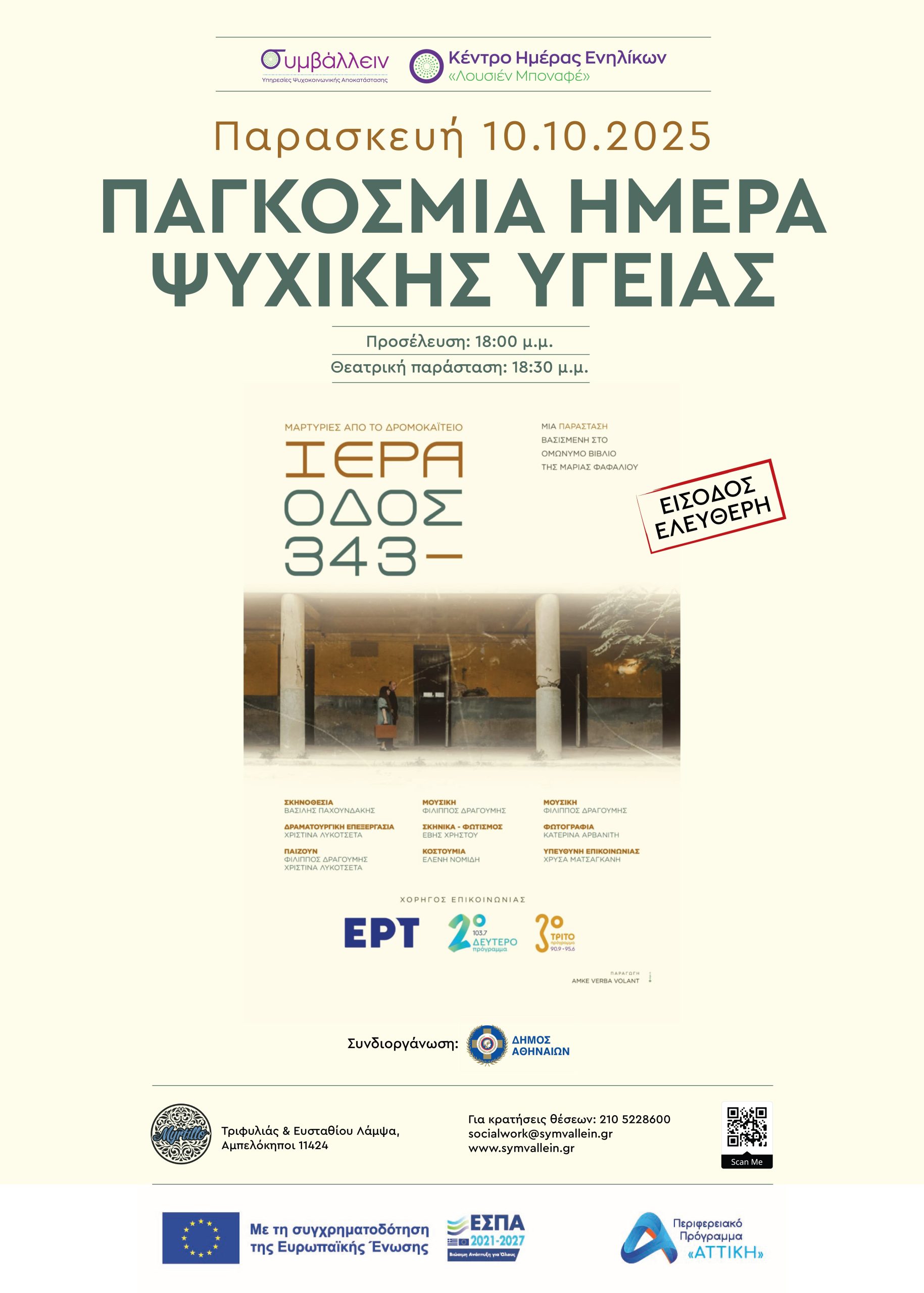 Στο πλαίσιο αυτό θα παρουσιαστεί η παράσταση «Ιερά Οδός 343 – Μαρτυρίες από το Δρομοκαΐτειο» βασισμένη στο Ομώνυμο Βιβλίο της Μαρίας Φαφαλιού, που αντλεί έμπνευση από αυθεντικές μαρτυρίες ανθρώπων που νοσηλεύτηκαν ή εργάστηκαν στο Δρομοκαΐτειο. Οι αφηγήσεις εναλλάσσονται και έρχονται να αναδείξουν εκτός από τα βιώματα των ίδιων των ασθενών, τις απόψεις, τις εμπειρίες και τα στερεότυπα που κουβαλούν συγγενείς, φίλοι, νοσηλευτικό και ιατρικό προσωπικό καθώς και όλοι οι «σημαντικοί άλλοι» των οποίων η στάση διαδραματίζει καθοριστικό ρόλο στην πορεία και την εξέλιξη της ένταξης των ψυχικά ασθενών στην κοινωνία των «υγιών».