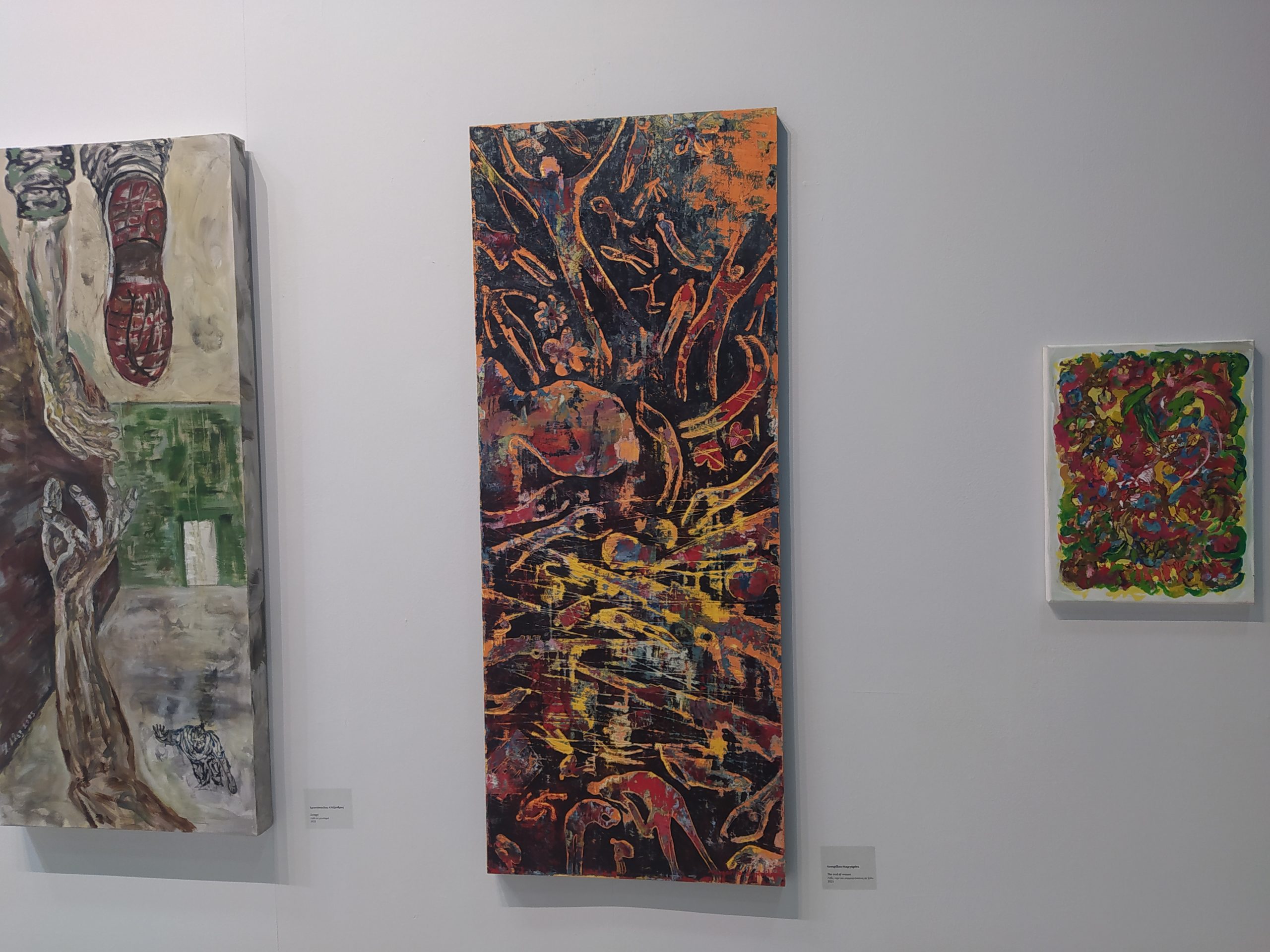 Από τα εκθέματα που δεν περιορίζονται στον καμβά, ξεχωρίζει το video art της Θαλασσινής Δούμα, που αποτυπώνει μια μαθητική πορεία για τα Τέμπη, τόσο για το μήνυμα αλλά κι επειδή είναι κοντά στα βιώματα μας. Αξιοσημείωτο επίσης το έργο «Ο Πνιγμός» του Χρήστου Μονοκρούσου, το οποίο δείχνει σε μικρή οθόνη ένα βίντεο που γνώρισε απήχηση στα social media: ο καλλιτέχνης εξηγεί το ναυάγιο της Πύλου ενώ ζωγραφίζει. Ένα έργο που όχι μόνο υπενθυμίζει ότι οτιδήποτε μπορεί να είναι τέχνη, αλλά επαναφέρει στις μνήμες μας κι αυτό το τραγικό γεγονός που η επικαιρότητα έχει σχεδόν σβήσει.