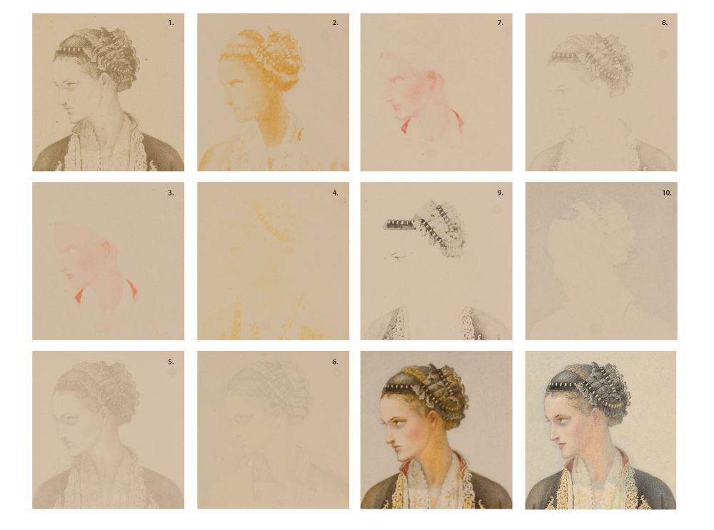 Ψηφιακή σύνθεση με τα 10 χωριστά λιθογραφημένα δοκίμια (1 -10) που παρήχθησαν κατά τη διαδικασία εκτύπωσης του πίνακα 46α του Nicolas Sperling. Στο τέλος, σύγκριση του δεκάχρωμου εκτυπωμένου αντιτύπου (αριστερά) και της πρωτότυπης υδατογραφίας της ενδυμασίας «Βέρροια» (δεξιά) (ΙΑ / ΕΤΕ, Συλλογή Εταιρείας Γραφικών Τεχνών Ασπιώτη – ΕΛΚΑ).