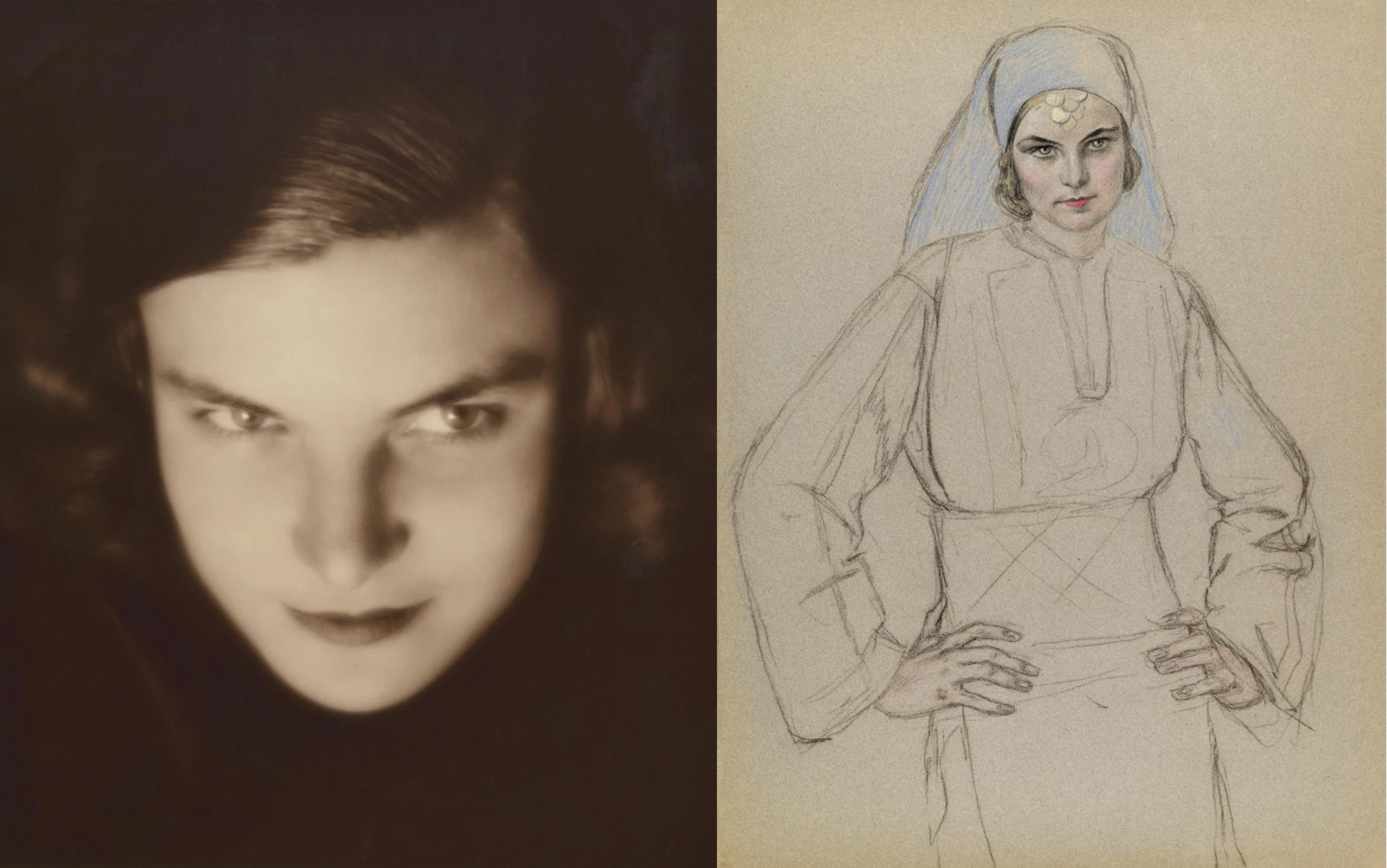 Nelly’s (Έλλη Σουγιουλτζόγλου-Σεϊραδάρη). Η Ειρήνη Καλλιγά, το γένος Μπενάκη, 1932 (αριστερά). Nicolas Sperling, «Γυναικεία μορφή με ενδυμασία από την Ανατολική Ρωμυλία (Καβακλί)», παστέλ και μολύβι σε χαρτί. Εικονίζεται η Ειρήνη Καλλιγά (δεξιά) (Μουσείο Μπενάκη).