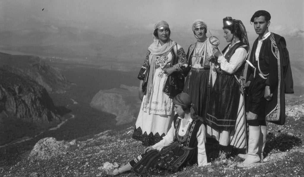 Nelly’s, (Έλλη Σουγιουλτζόγλου-Σεϊραδάρη), συνεργάτες της Έκθεσης Λαϊκής Χειροτεχνίας που διοργανώθηκε στο πλαίσιο των Δελφικών Εορτών, φορώντας ενδυμασίες από διάφορες περιοχές της Ελλάδας, Δελφοί 1930 (Μουσείο Μπενάκη).