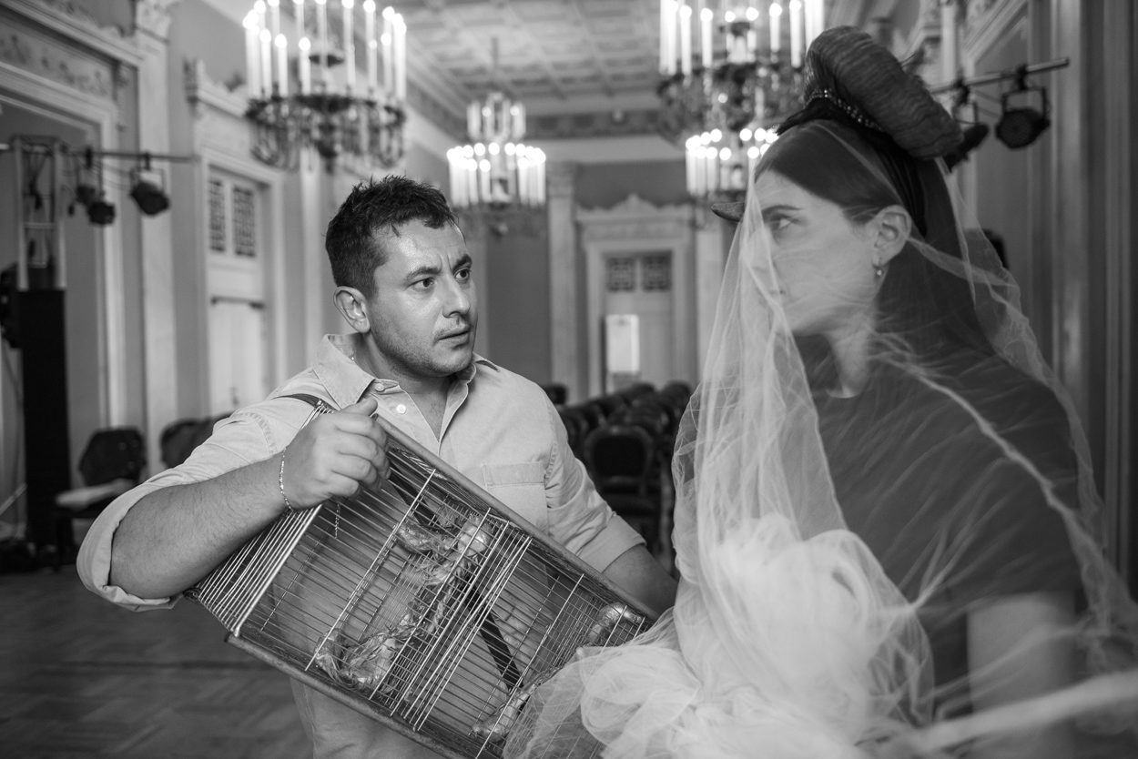 Δημήτρης Λιόλιος: Το Φουαγιέ του Δημοτικού Θεάτρου Πειραιά δεν είναι απλώς μια πρακτική λύση χώρου, αλλά μια συνειδητή καλλιτεχνική επιλογή που αλλάζει την εμπειρία της παράστασής μας. Είναι, άλλωστε, και ένα ιδιαίτερα φορτισμένο ιστορικό τοπόσημο. Με τον χαρακτήρα του «μεσάζοντα», λειτουργεί και ως μέρος της ίδιας της αφήγησής μας, τόσο δραματουργικά όσο και εικαστικά. Εδώ, κάνουμε μια απόπειρα να ξεπεράσουμε τα όρια, να καταργήσουμε αυτή την ψευδαίσθηση του «κάπου μακριά». Ενδεχομένως, μαζί και την ανάλογη αμηχανία. Σε αυτή την ιστορία, όλα συμβαίνουν σε χρόνο ενεστώτα. Η καρδιά του έργου μας είναι ένα ζωντανό οικοσύστημα σχέσεων και ο κάθε θεατής συμπαίκτης μας, πριν καν ακόμα ξεκινήσει η παράσταση. «Σταμάτα, κι άσε τον κόσμο να γυρίζει…»