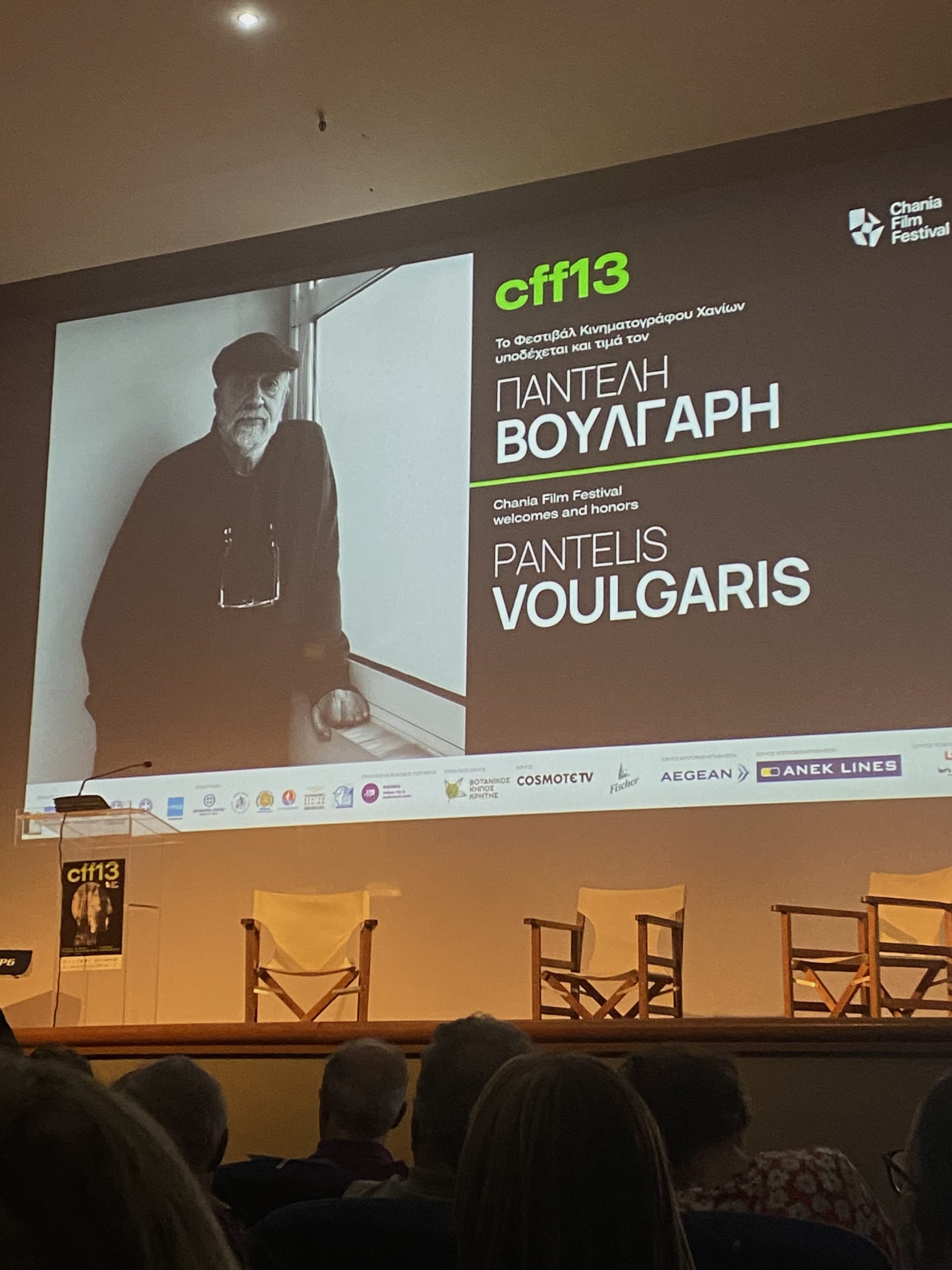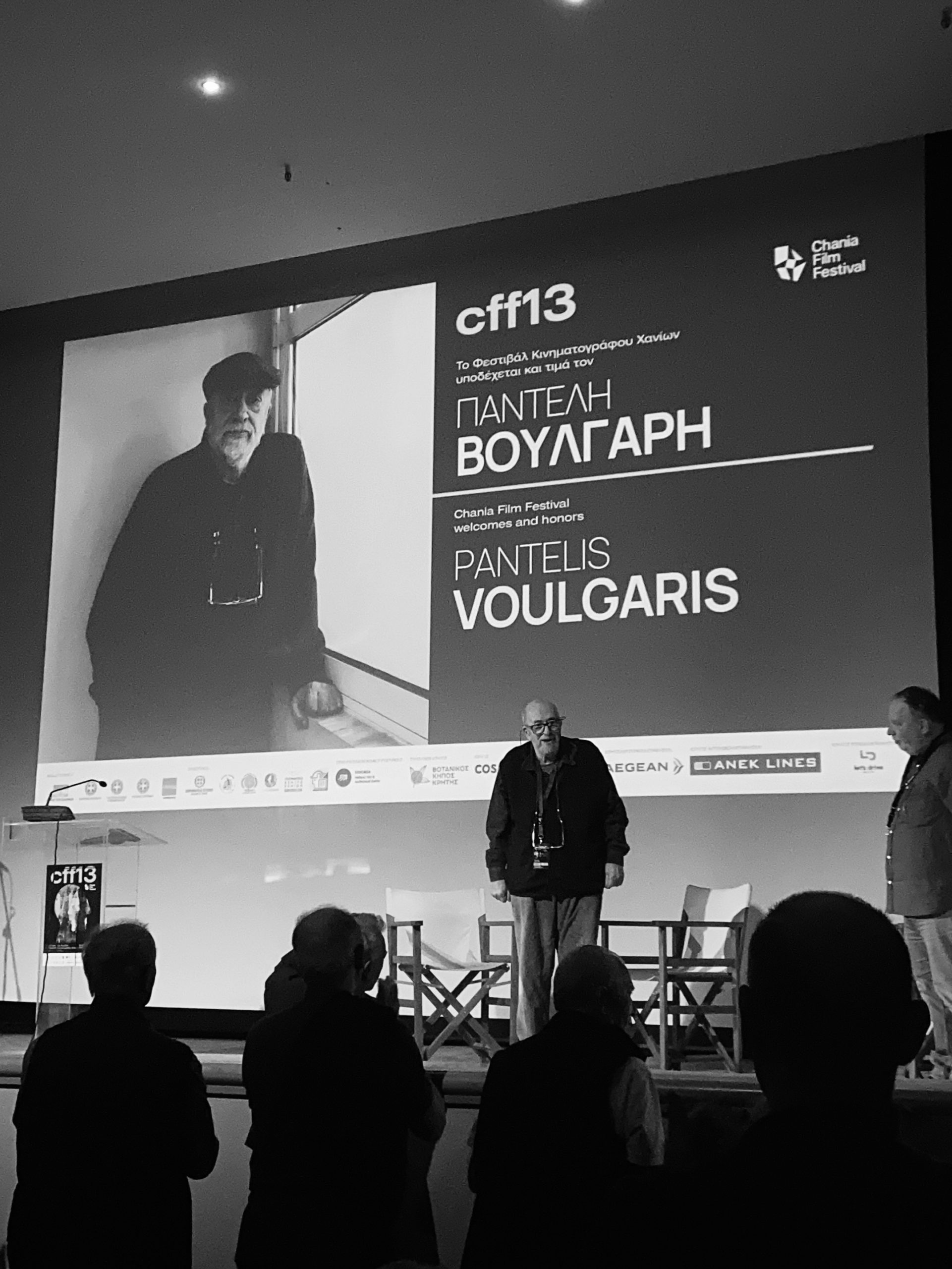 «Εγώ ποδοσφαιριστής ήθελα να γίνω» είναι η πρώτη φράση που λέει μόλις ανεβαίνει στη σκηνή, μετά την προβολή της τελευταίας ταινίας του «Το Τελευταίο Σημείωμα». Ο κόσμος δεν σταματούσε να χειροκροτάει όσο ο Παντελής Βούλγαρης και η συγγραφέας και σύζυγός του, Ιωάννα Καρυστιάνη, ανέβαιναν στη σκηνή. Νομίζω πως έχω συναντήσει πολύ λίγους ανθρώπους και καλλιτέχνες στο εύρος του Παντελή Βούλγαρη που να είναι τόσο ευγενικοί και ανοιχτοί, με αυτή τη γλύκα στα μάτια. Είχα την τύχη να του έχω σφίξει ξανά το χέρι, πάλι σε μία προβολή ταινίας του παλαιότερα, και τα μάτια του ήταν το ίδιο καθαρά και γεμάτα νοιάξιμο. Όταν το Φεστιβάλ Κινηματογράφου Χανίων ανακοίνωσε το αφιέρωμά του και την τιμητική εκδήλωση στον τεράστιο δημιουργό, αλλά και την έκδοση ενός βιβλίου με τίτλο «Παντελής Βούλγαρης – Μίας ζωής ταινίες», που αναδεικνύει όλη την πορεία της ζωής του μέσα από τις ταινίες του, με τη συνεργασία και το αρχείο του ίδιου, ο ενθουσιασμός ήταν το βασικό συναίσθημα που κυριαρχούσε – και από τις δύο πλευρές.
