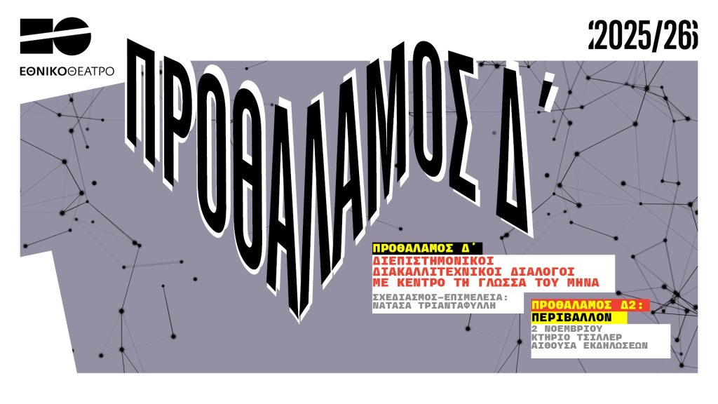 Με άξονα την κεντρική θεματική του Καλλιτεχνικού του Προγράμματος για τον μήνα Νοέμβριο, το Περιβάλλον, συνεχίζεται ο Προθάλαμος Δ2: Διεπιστημονικοί Διακαλλιτεχνικοί Διάλογοι με κέντρο τη «Γλώσσα του μήνα», η νέα δράση του Εθνικού Θεάτρου, σε σχεδιασμό και επιμέλεια Νατάσας Τριανταφύλλη. Την Κυριακή 2 Νοεμβρίου, η Αίθουσα Εκδηλώσεων του Κτηρίου Τσίλλερ μετατρέπεται ξανά σε έναν χώρο δημιουργικής σύμπραξης, όπου επιστήμονες και καλλιτέχνες αναζητούν κοινούς τόπους έμπνευσης μέσα από μια ιδιότυπη συνομιλία.