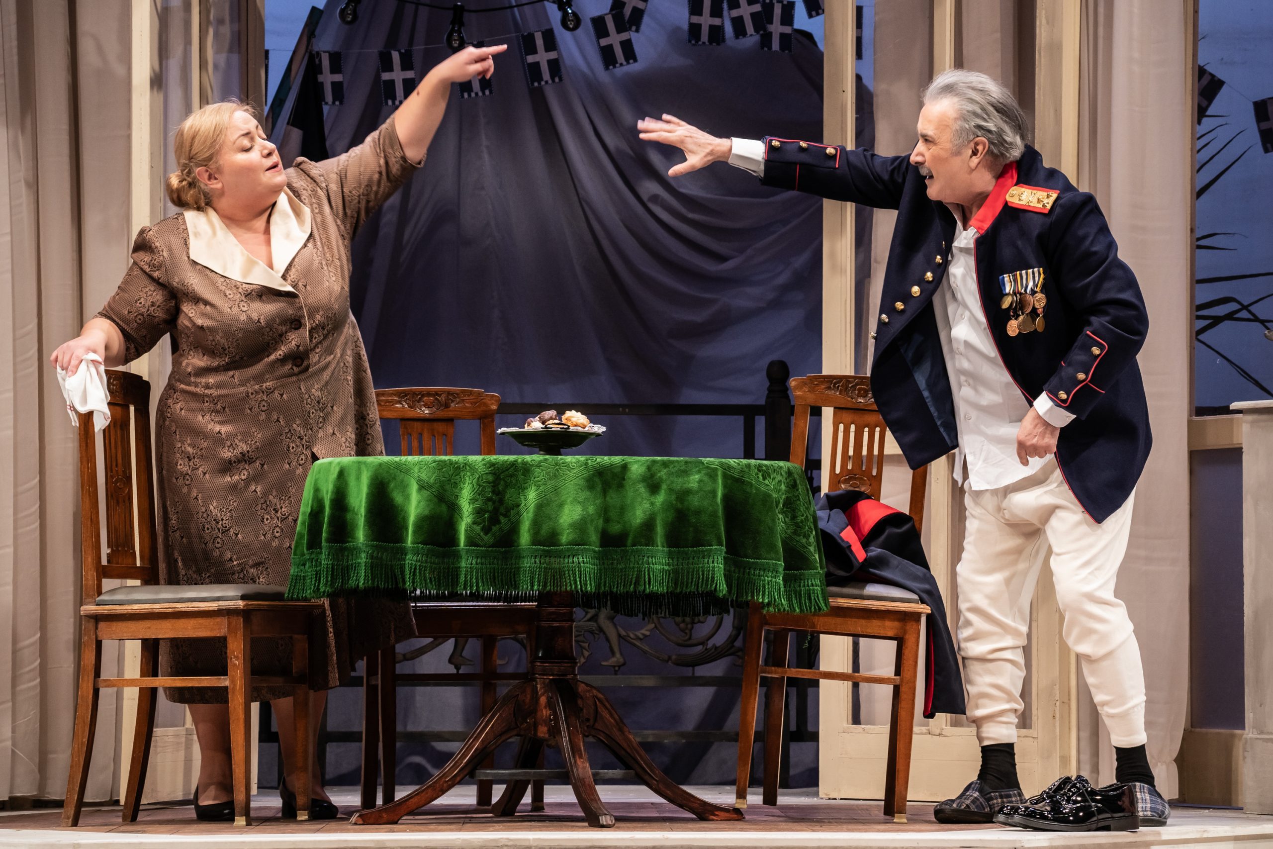 Την αγαπημένη φιγούρα του στρατηγού Λάμπρου Δεκαβάλλα ενσαρκώνει ο Λάκης Λαζόπουλος, αποδίδοντας τον ρόλο με ευαισθησία και μέτρο, που επιτρέπουν να αναδειχθεί η ανθρώπινη διάσταση του ήρωα πίσω από το χιούμορ· εκείνη του ιδεαλιστή απόστρατου και οικογενειάρχη, του καλοπροαίρετου, ευσυνείδητου ανθρώπου, ο οποίος ζει με τις αναμνήσεις του και παραμένει όρθιος, υπερήφανος, ανυποχώρητος ακόμη κι όταν βλέπει γύρω του τα ιδανικά και τις αξίες με τις οποίες έζησε ολόκληρη τη ζωή του – και για τις οποίες κάποτε πολέμησε – να αμαυρώνονται και να λεηλατούνται. Η Παρθένα Χοροζίδου στον ρόλο της συζύγου Ειρήνης γίνεται εκείνη η “ρεαλίστρια” που με κατανόηση και στοργή προσπαθεί να προσγειώσει τον σύζυγο της και στρατηγό στην πραγματικότητα όταν ο νους του χάνεται στα παλιά ανδραγαθήματα του, ενώ με έκδηλη κωμικότητα επωμίζεται το βάρος της διαχείρισης των οικονομικών του νοικοκυριού. Με τον υπόλοιπο θίασο -Παύλος Ορκόπουλος, Τάσος Παλαντζίδης, Σταύρος Μαρκάλας, Κωνσταντίνος Τραφαλής, Θράσος Σταθόπουλος, Ιωάννα Ανεμογιάννη, Κωνσταντίνος Γιάννης, Φαίδρα Σκλήρη, Λαζάρια Σαζεΐδου- να δίνει σάρκα και οστά επί σκηνής σε γνήσιους χαρακτήρες της μεταπολεμικής ελληνικής κοινωνίας συμβάλλοντας στη ζωντανή, αληθινή αναπαράσταση του κλασικού έργου.