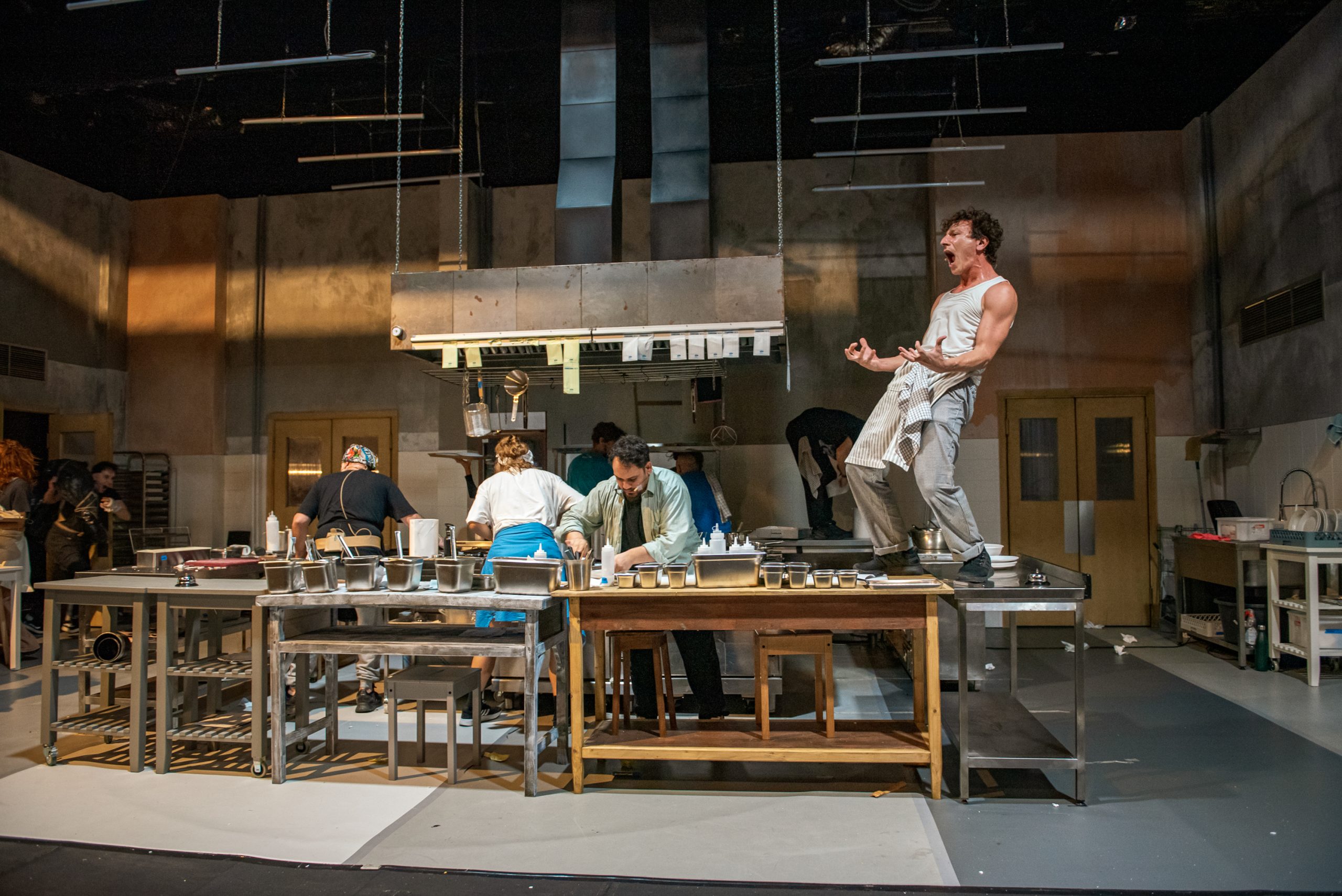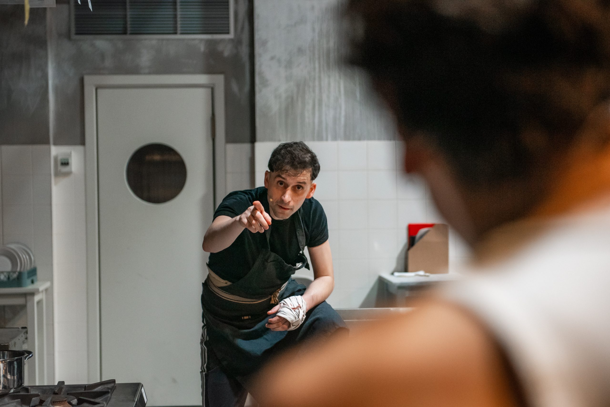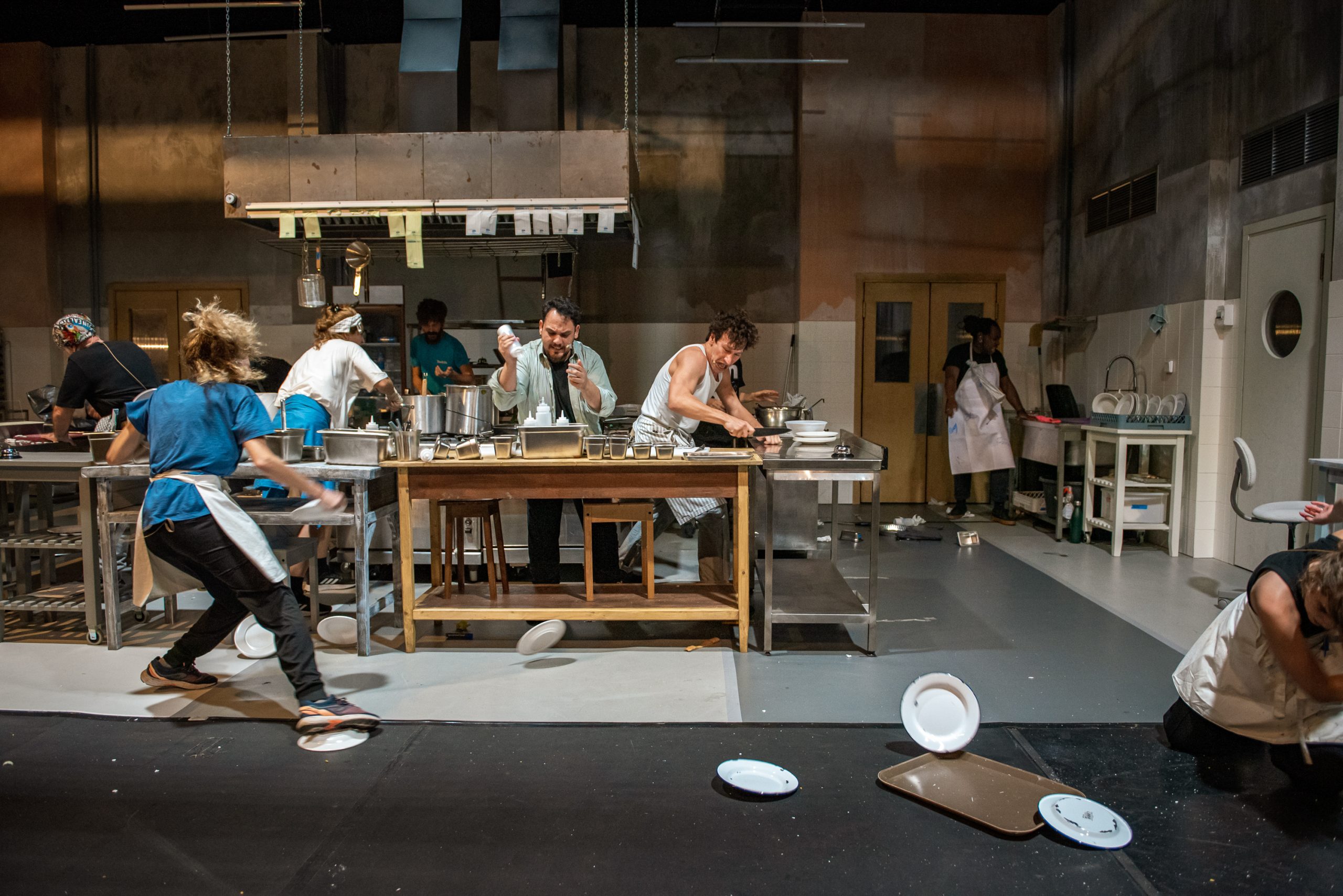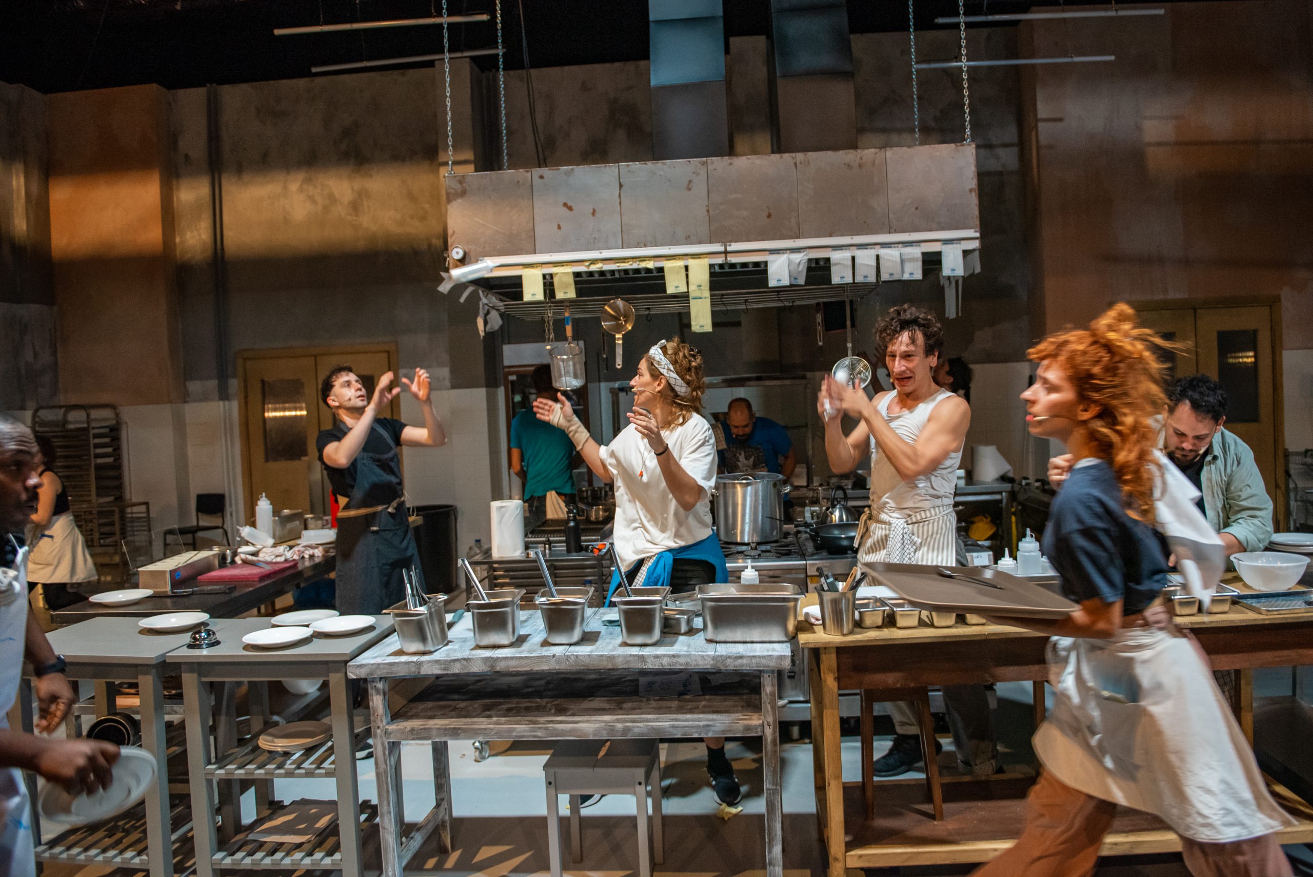 Ταψιά, κατσαρόλες, ποτήρια, κουτάλες, πιάτα, τρίφτες. Και άνθρωποι. Άνθρωποι από την Ιταλία, την Αγγλία, την Πολωνία, την Τουρκία, την Γκάνα, την Αλβανία. Άνθρωποι με μαγειρικά σκουφιά που μετρούν τους κάλους και τα κοψίματα από τα μαχαίρια στις παλάμες των χεριών τους. Άνθρωποι που σερβίρουν 1500 πελάτες την ημέρα. Άνθρωποι που κοπιάζουν, που βρωμάνε ψάρι και κρεμμύδι, που ο ιδρώτας στο σώμα τους αναμειγνύεται τους με τους υδρατμούς του απορροφητήρα. Άνθρωποι που σπάνε και γίνονται κομμάτια σαν τα πιάτα και σαν τα ποτήρια της κουζίνας. «Να σπάσω πιάτα;» ρωτάει ο Τζούλιο Κατσής τον Γιώργο Κουτλή πριν δοθεί το σύνθημα εκκίνησης της πρόβας. «Σπάσε», ακούγεται η φωνή του σκηνοθέτη από την πλατεία της Κιβωτού. «Να βάλω κι αίμα;», συνεχίζει να απορεί ο ηθοποιός; «Όχι αίμα», απαντάει ξανά ο σκηνοθέτης.