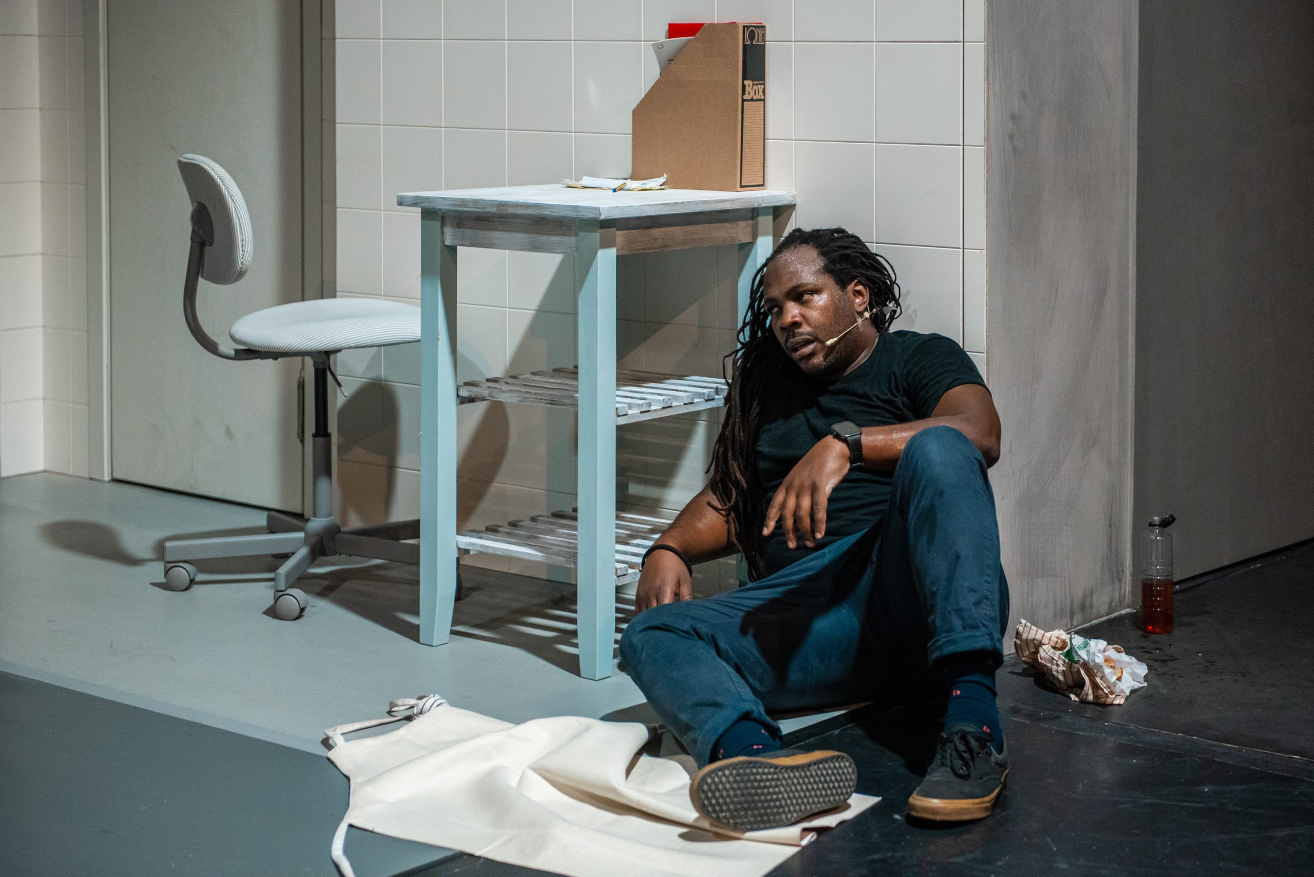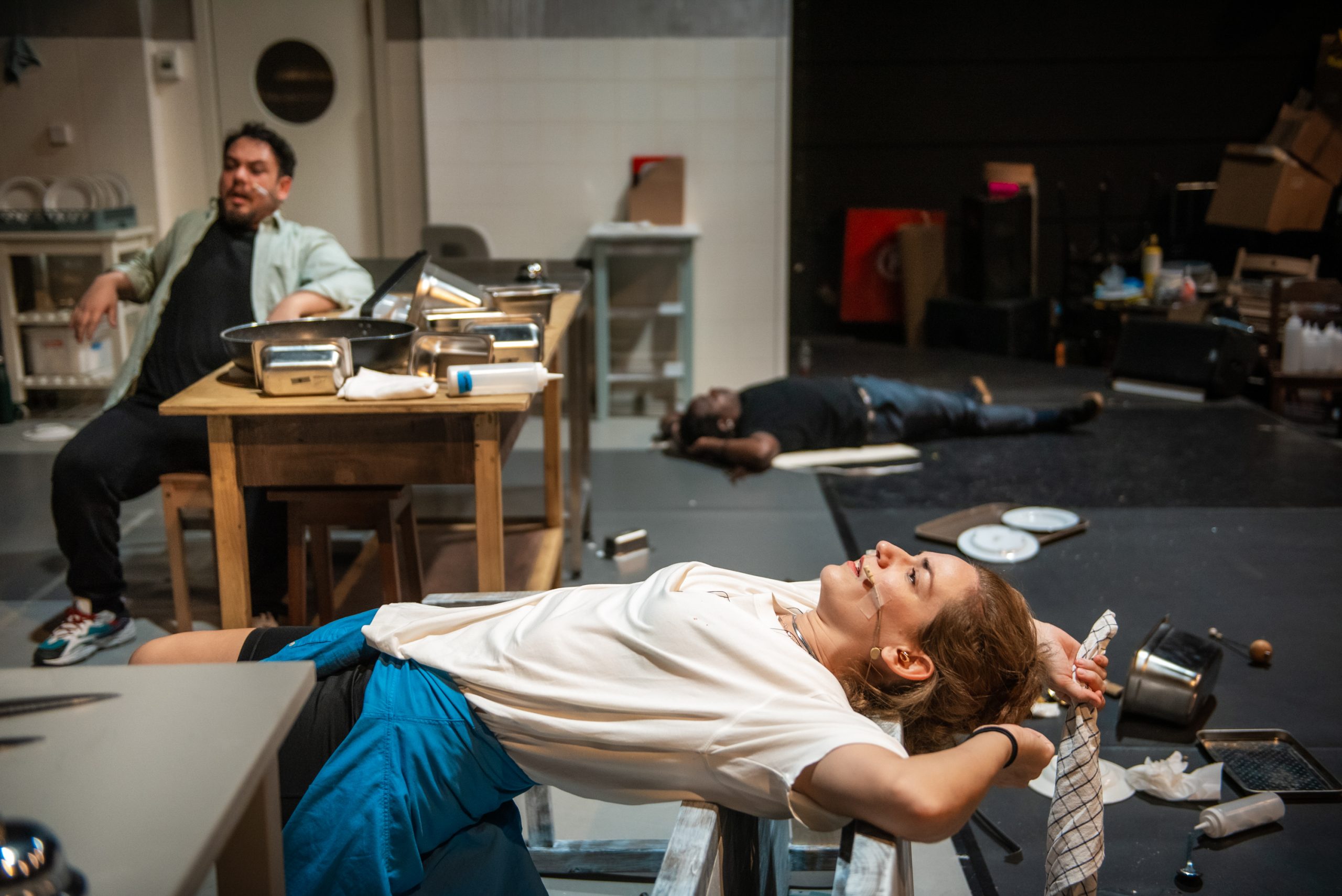 Ταψιά, κατσαρόλες, ποτήρια, κουτάλες, πιάτα, τρίφτες. Και άνθρωποι. Άνθρωποι από την Ιταλία, την Αγγλία, την Πολωνία, την Τουρκία, την Γκάνα, την Αλβανία. Άνθρωποι με μαγειρικά σκουφιά που μετρούν τους κάλους και τα κοψίματα από τα μαχαίρια στις παλάμες των χεριών τους. Άνθρωποι που σερβίρουν 1500 πελάτες την ημέρα. Άνθρωποι που κοπιάζουν, που βρωμάνε ψάρι και κρεμμύδι, που ο ιδρώτας στο σώμα τους αναμειγνύεται τους με τους υδρατμούς του απορροφητήρα. Άνθρωποι που σπάνε και γίνονται κομμάτια σαν τα πιάτα και σαν τα ποτήρια της κουζίνας. «Να σπάσω πιάτα;» ρωτάει ο Τζούλιο Κατσής τον Γιώργο Κουτλή πριν δοθεί το σύνθημα εκκίνησης της πρόβας. «Σπάσε», ακούγεται η φωνή του σκηνοθέτη από την πλατεία της Κιβωτού. «Να βάλω κι αίμα;», συνεχίζει να απορεί ο ηθοποιός; «Όχι αίμα», απαντάει ξανά ο σκηνοθέτης.