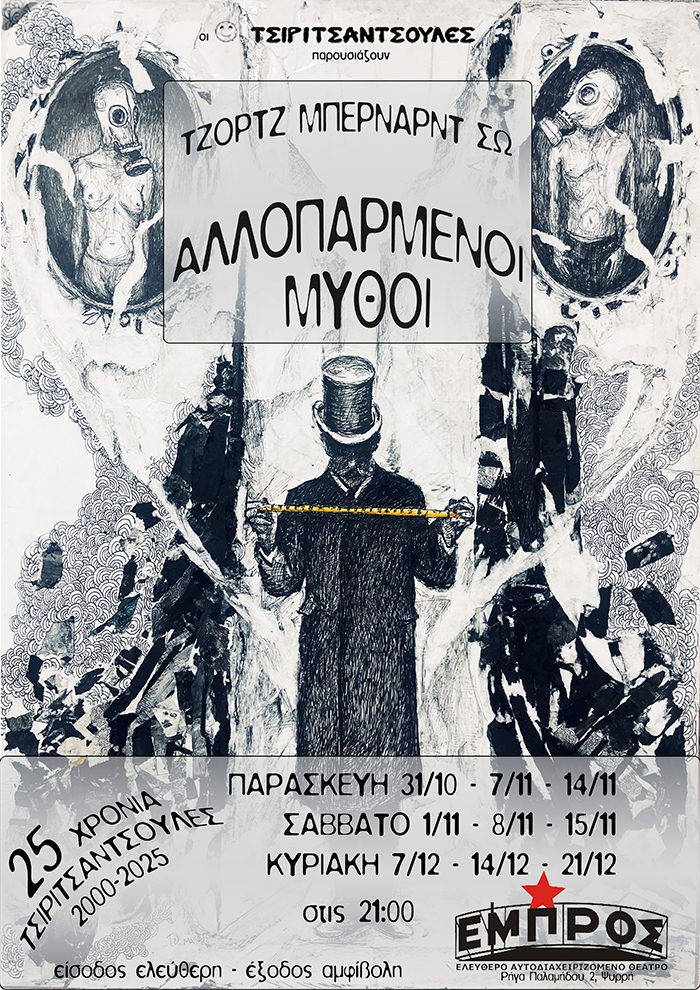 Οι Τσιριτσάντσουλες παρουσιάζουν τη θεατρική παράσταση Αλλοπαρμένοι Μύθοι του Τζορτζ Μπέρναρντ Σω. Παίζουν: Ντίνα Μαυρίδου, Νίκος Γλυκόπουλος, Μαρίνος Μουζάκης. Στον ρόλο του Τζορτζ Μπέρναρντ Σω ακούγεται η φωνή του Γρηγόρη Κλιούμη. Μετάφραση-κούκλες-μάσκες-κοστούμια: Μαρία Μαρκοπούλου. Σκηνικά-αφίσα-εξώφυλλο προγράμματος: Διονύσης Ματαράγκας. Κατασκευή κοστουμιών: Αγγελική Βασιλοπούλου. Κατασκευή σκηνικού: Κώστας Βαλατσός. Κατασκευή σκηνικών αντικειμένων: Μαρία Μαρκοπούλου, Ντίνα Μαυρίδου, Νίκος Γλυκόπουλος, Ολυμπία Ζωγοπούλου-Παπαλιάκου.Ηχοληψία-μίξη ήχου: Νίκος Γιούσεφ. Διεύθυνση παραγωγής: Ντίνα Μαυρίδου.Σκηνοθεσία, κινησιολογία, μουσικές επιλογές, παραγωγή: Τσιριτσάντσουλες 2025.