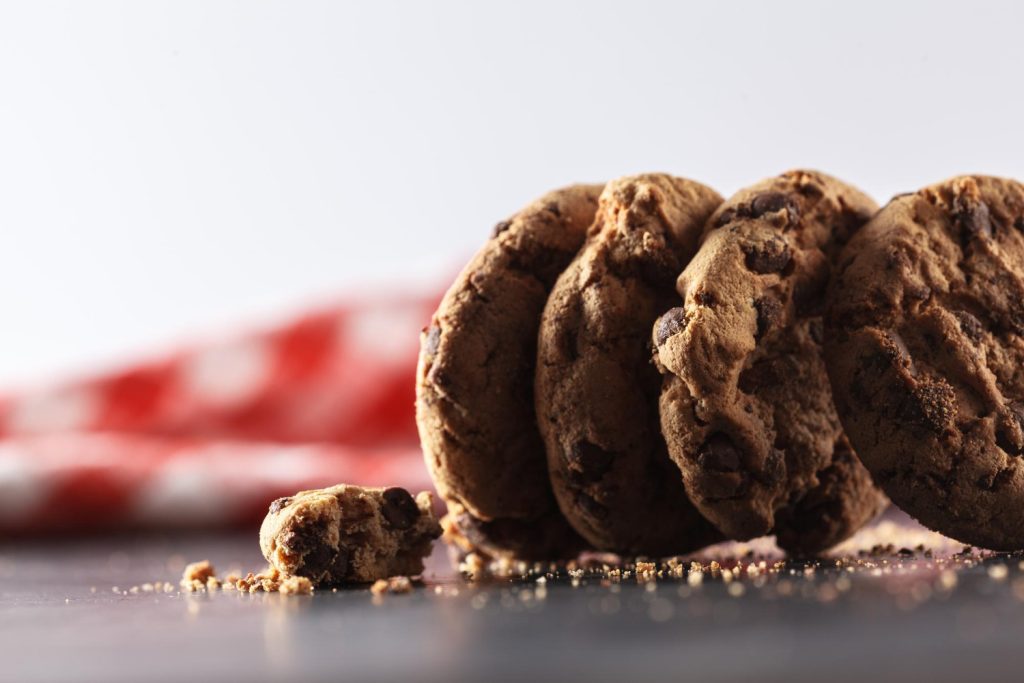 Στρώνουμε με αντικολλητικό χαρτί τη λαμαρίνα του φούρνου. Μεταφέρουμε εκεί τα μπισκότα με το κουτάλι και πασπαλίζουμε με σταγόνες σοκολάτες.