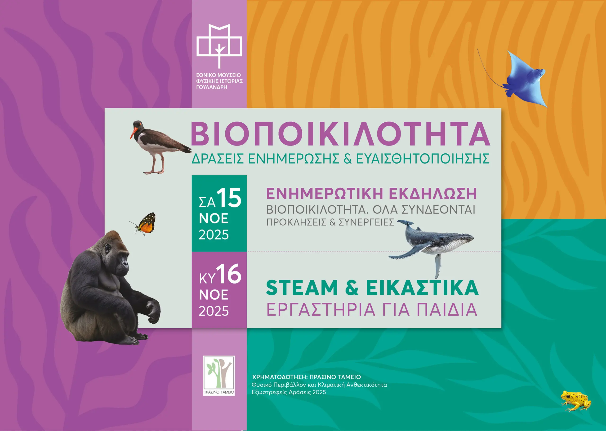 Αξιοποιώντας τη νέα έκθεση «Βιοποικιλότητα: Όλα συνδέονται», το Μουσείο προσκαλεί μικρούς και μεγάλους σε ένα πλούσιο διήμερο που περιλαμβάνει: Ενημερωτική εκδήλωση για τη βιοποικιλότητα (Σάββατο 15/11, Αμφιθέατρο «Άγγελος Γουλανδρής», Κέντρο ΓΑΙΑ), βιωματικό εργαστήριο STEAM για παιδιά 5–10 ετών με τίτλο Παγωμένα αυγά δεινοσαύρου σε συνεργασία με το Children’s Institute of Technology (Κυριακή 16/11, Κέντρο ΓΑΙΑ), εικαστικό Εργαστήριο για παιδιά παιδιά 5–10 ετών με θέμα τη βιοποικιλότητα με τον εικαστικό Γιάννη Κρανιδιώτη (Κυριακή 16/11, Κέντρο ΓΑΙΑ)καθώς και 0ργανωμένες ξεναγήσεις στη νέα έκθεση. Στόχος της δράσης είναι η ενημέρωση και ευαισθητοποίηση του κοινού για τη σημασία της βιοποικιλότητας, η ενίσχυση της περιβαλλοντικής συνείδησης των νέων και η προώθηση της ενεργού συμμετοχής στην προστασία της φύσης.
