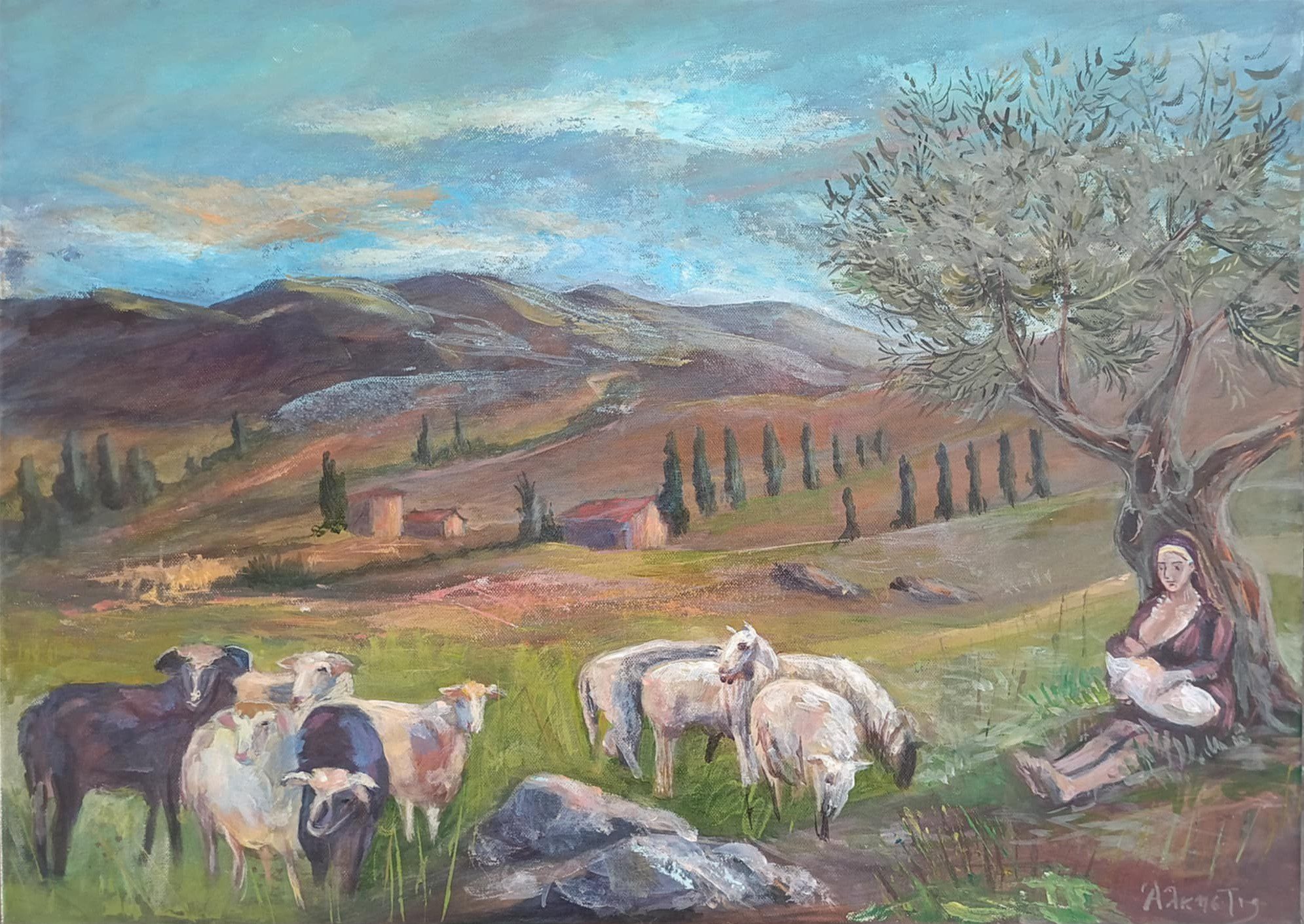 Άλκηστις Παντοπούλου, Μνήμες γυναίκας στην ύπαιθρο ΚΑΠΟΤΕ – Βουκολικό, 50x70cm, Ακρυλικά σε καμβά