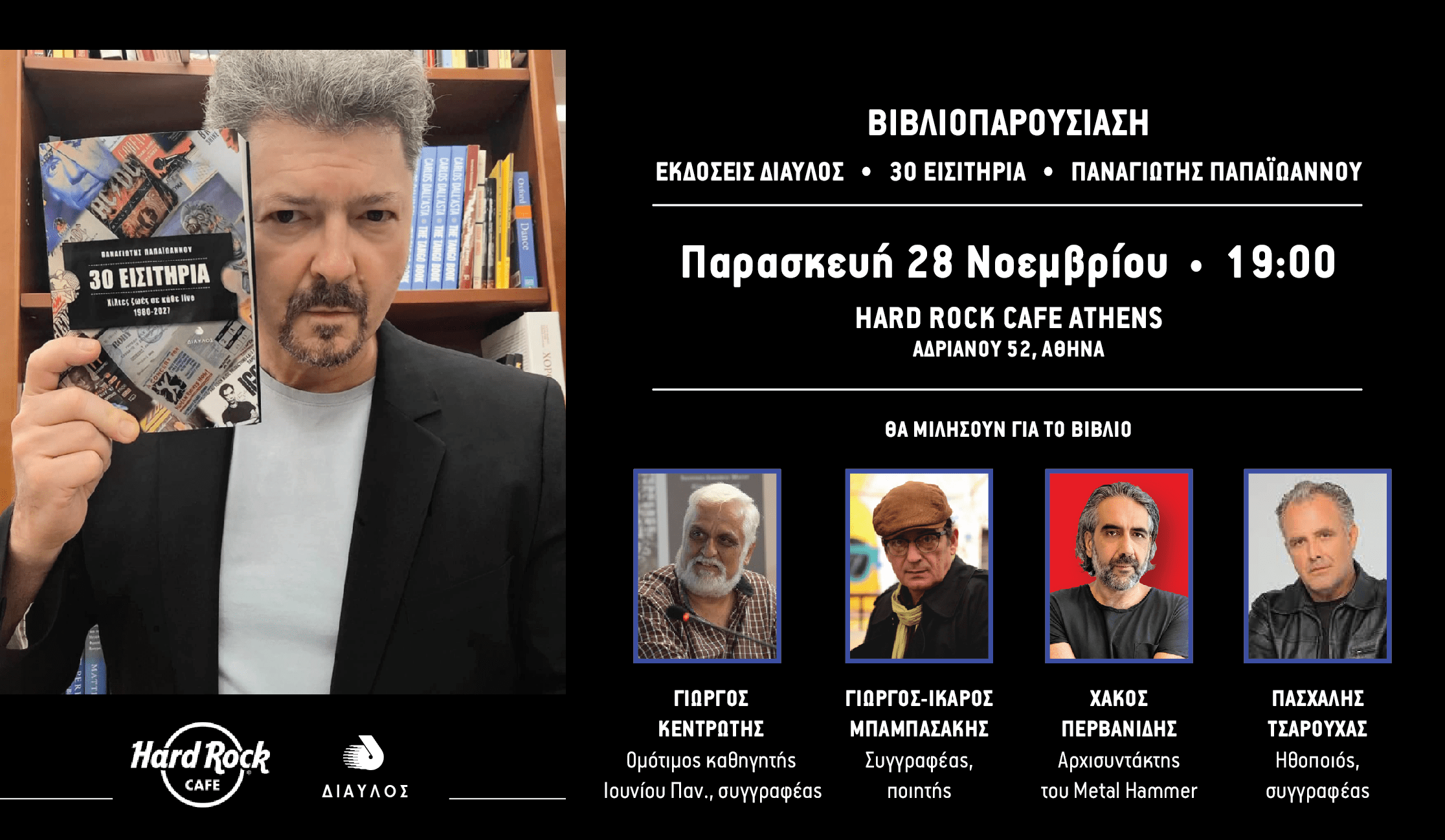Η πρώτη παρουσίαση του βιβλίου 30 Εισιτήρια” (χίλιες ζωές σε κάθε live) στην Αθήνα θα γίνει την Παρασκευή 28 Νοεμβρίου στις 19.00 στο Hard Rock Cafe Athens (Ανδριανού 52) με ελεύθερη είσοδο για το κοινό.