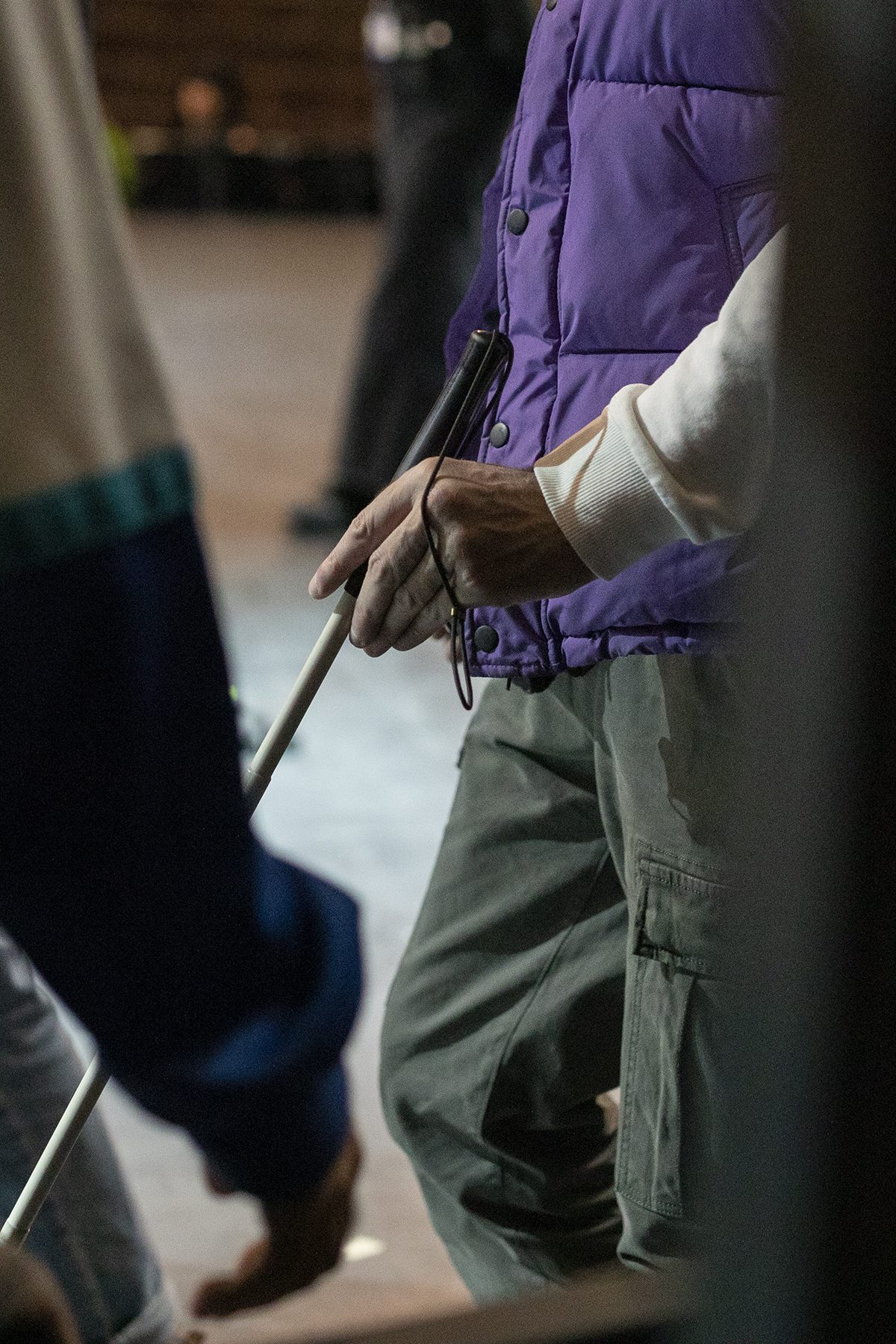 Πλάνο από την παράσταση “Mami” σε σκηνοθεσία Μάριο Μπανούσι που ανέβηκε πέρυσι στη Στέγη: θεατές με προβλήματα όρασης ανεβαίνουν στη σκηνή στο πλαίσιο της απτικής ξενάγησης. @Μαργαρίτα Γιόκο Νικητάκη