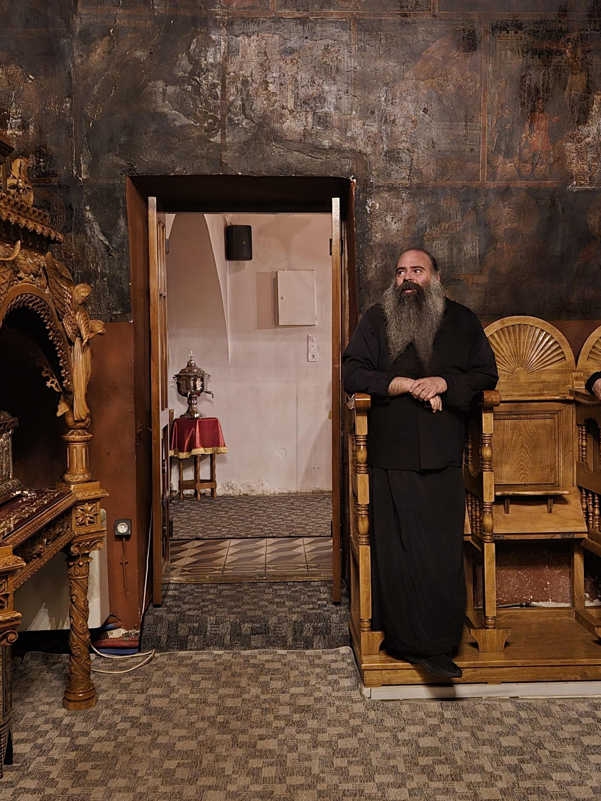 Λίγο πριν το σούρουπο φτάνουμε στην επιβλητική Ιερά Μονή Αγίου Νικολάου Βαρσών που μου θυμίζει κάτι από Όνομα του Ρόδου με μια στάλα Game of Thrones. Οι μοναχοί είχαν πια πιστέψει ότι δεν θα φτάναμε. ‘Σας καλούσα, αλλά δεν είχε σήμα’, τους λέει η συνοδός μας. «Είναι δέκα χρόνια τώρα που τα κινητά μας είναι εκτός λειτουργίας», της απαντά γελώντας ο πατέρας. «Τα μοναστήρια επέλεγαν να τα χτίσουν στη θέση των παλιών ασκηταριών, σε δύσβατες περιοχές», συνεχίζει. «Σήμερα πλέον μας βρίσκουν όπου κι αν πάμε, δεν υπάρχει πια ερημιά».