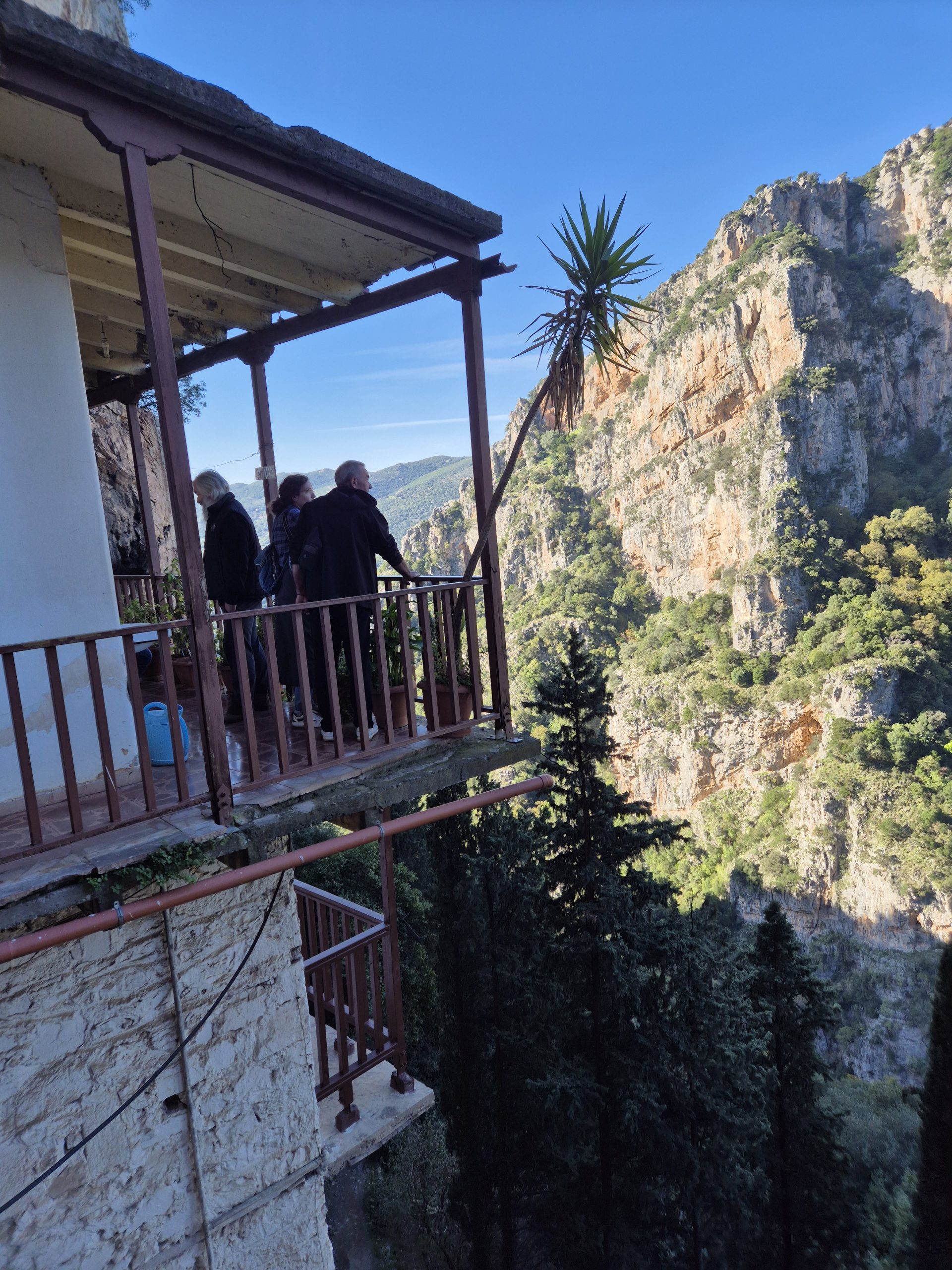 Το επόμενο πρωινό, το αυτοκίνητο μας αφήνει για να συνεχίσουμε πια μόνοι μας ένα βατό καταπράσινο μονοπάτι μέσα στο δάσος με τις καρυδιές και τις βελανιδιές. Η Μονή Αγίου Ιωάννη Προδρόμου (ή Τιμίου Προδρόμου) κυριολεκτικά μας κόβει την ανάσα, καθώς είναι χτισμένη στην κοιλότητα του απότομου βράχου και την ανακαλύπτουμε κρεμαστή μπροστά μας, καθώς ορθώνουμε το βλέμμα. Χτίστηκε το 1167 (είναι να απορείς πώς) στη θέση 60 περίπου παλιών ασκηταριών και η νεότερη, δεύτερη πτέρυγα χτίστηκε το 1860.