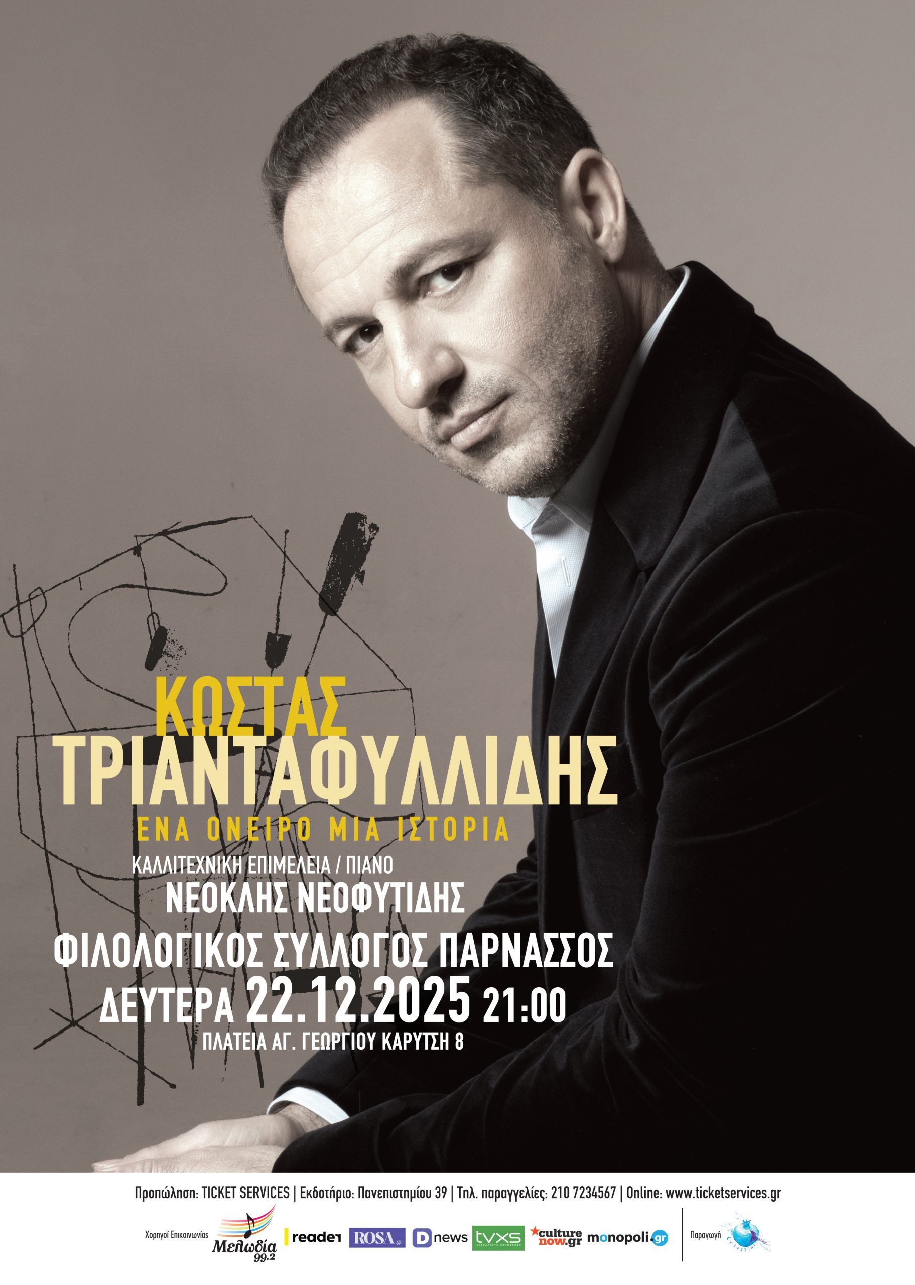 Ο Κώστας Τριανταφυλλίδης, ένας τραγουδιστής με σπάνιο ερμηνευτικό χάρισμα που έχει κερδίσει τα τελευταία χρόνια την αγάπη του κοινού, παρουσιάζει στον Φιλολογικό Σύλλογο Παρνασσού, τη Δευτέρα 22 Δεκεμβρίου, ένα ρεσιτάλ φωνής και πιάνου με τίτλο Ένα όνειρο, μια ιστορία για δεύτερη φορά μετά την επιτυχημένη πρώτη παράσταση. Μαζί του στο πιάνο ο Νεοκλής Νεοφυτίδης που υπογράφει και την καλλιτεχνική επιμέλεια.