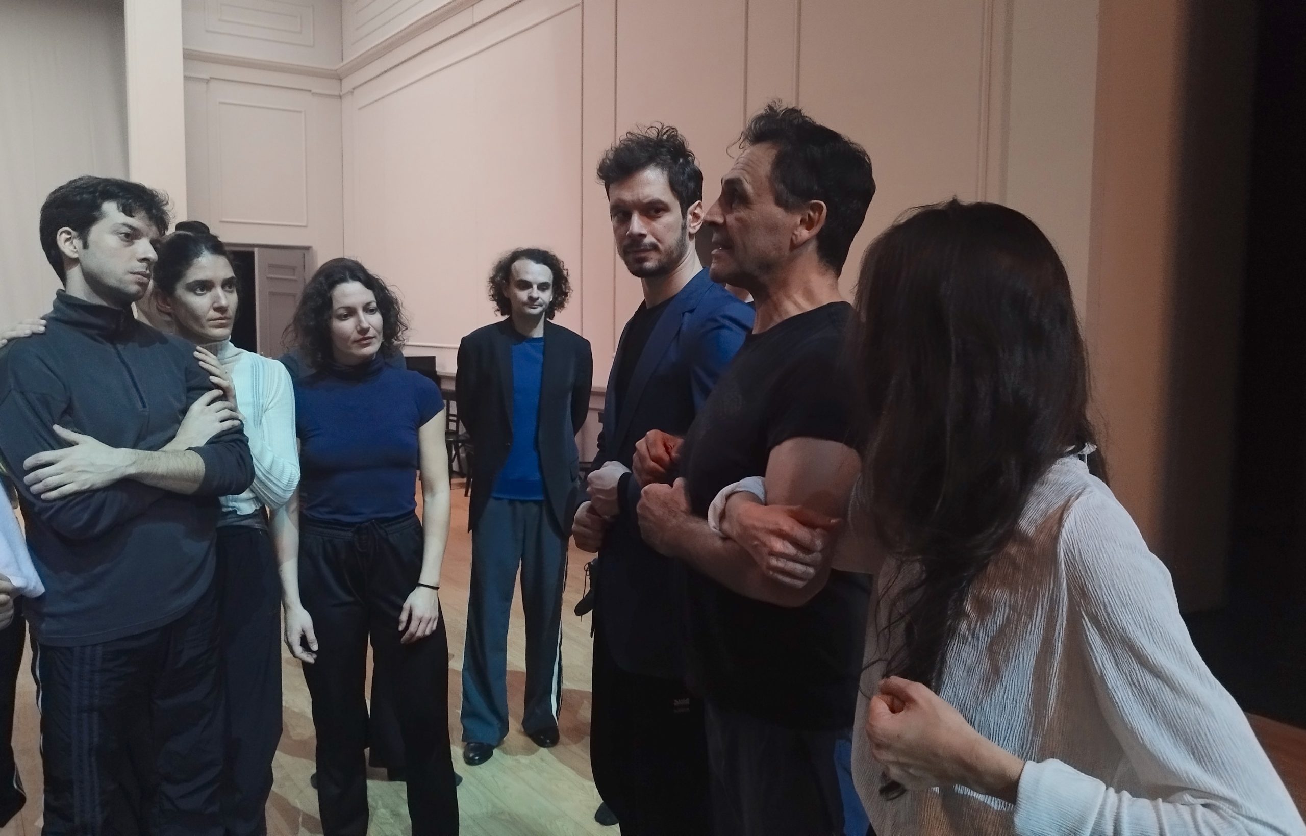 Ο Δάφνις Κόκκινος στη φάση της πρόβας με την ομάδα του Εθνικού Θεάτρου.
