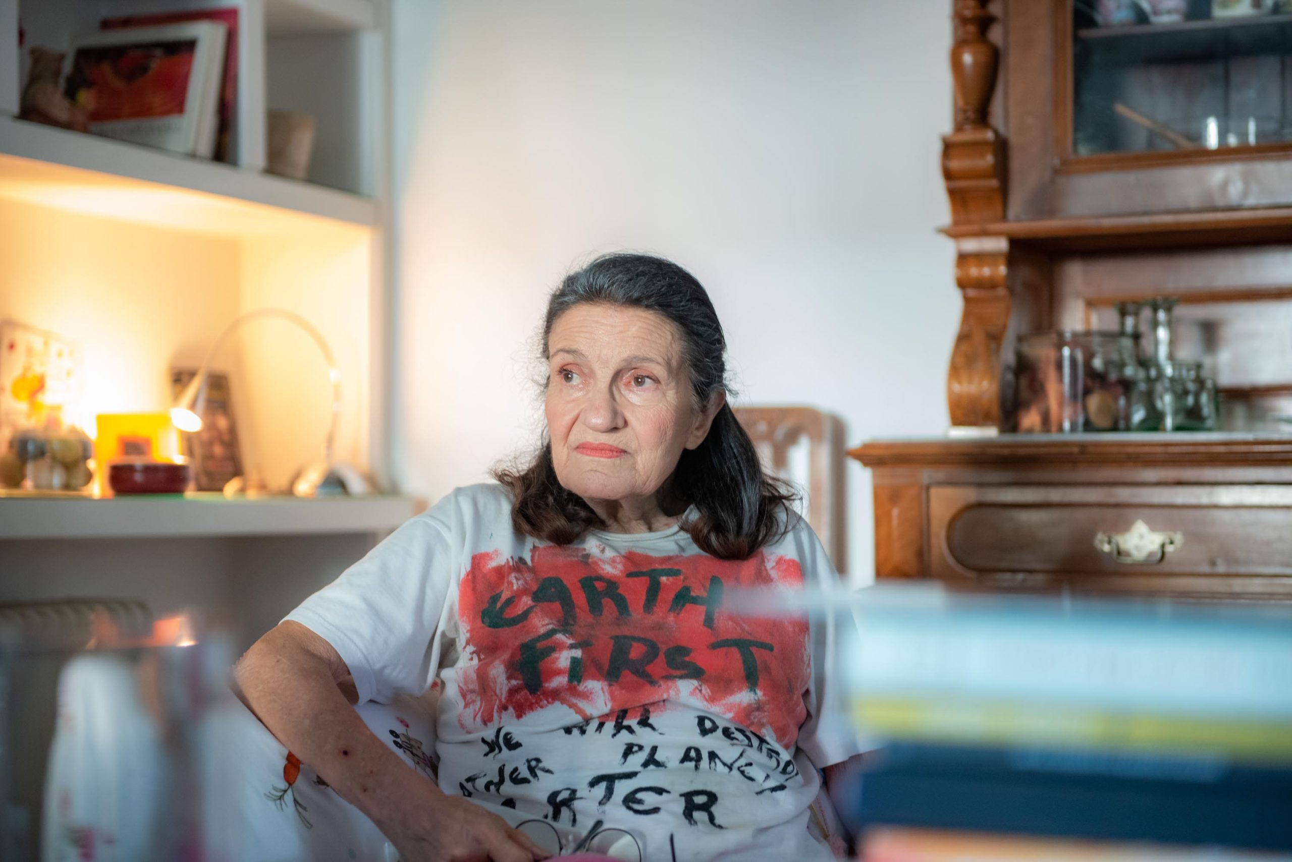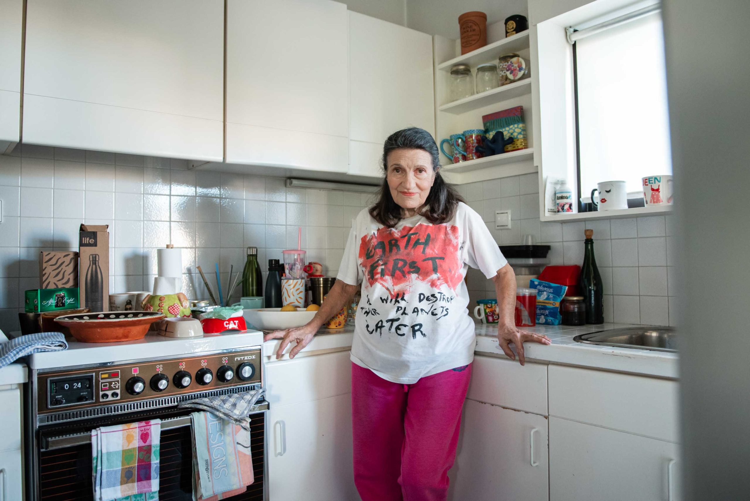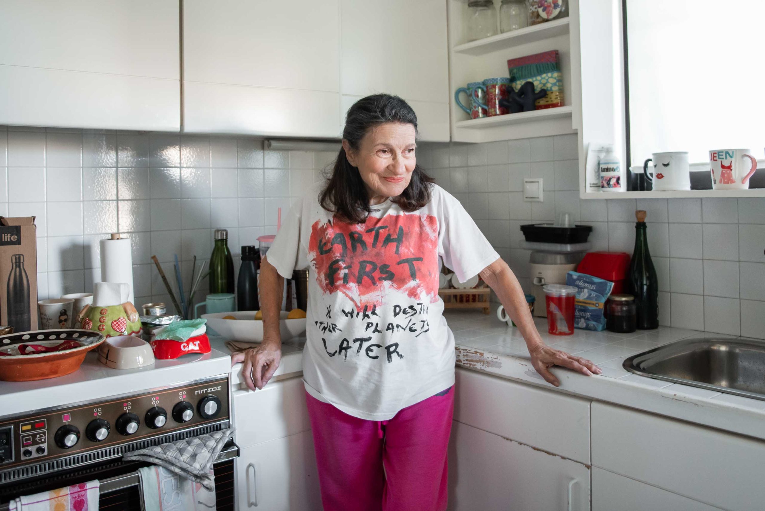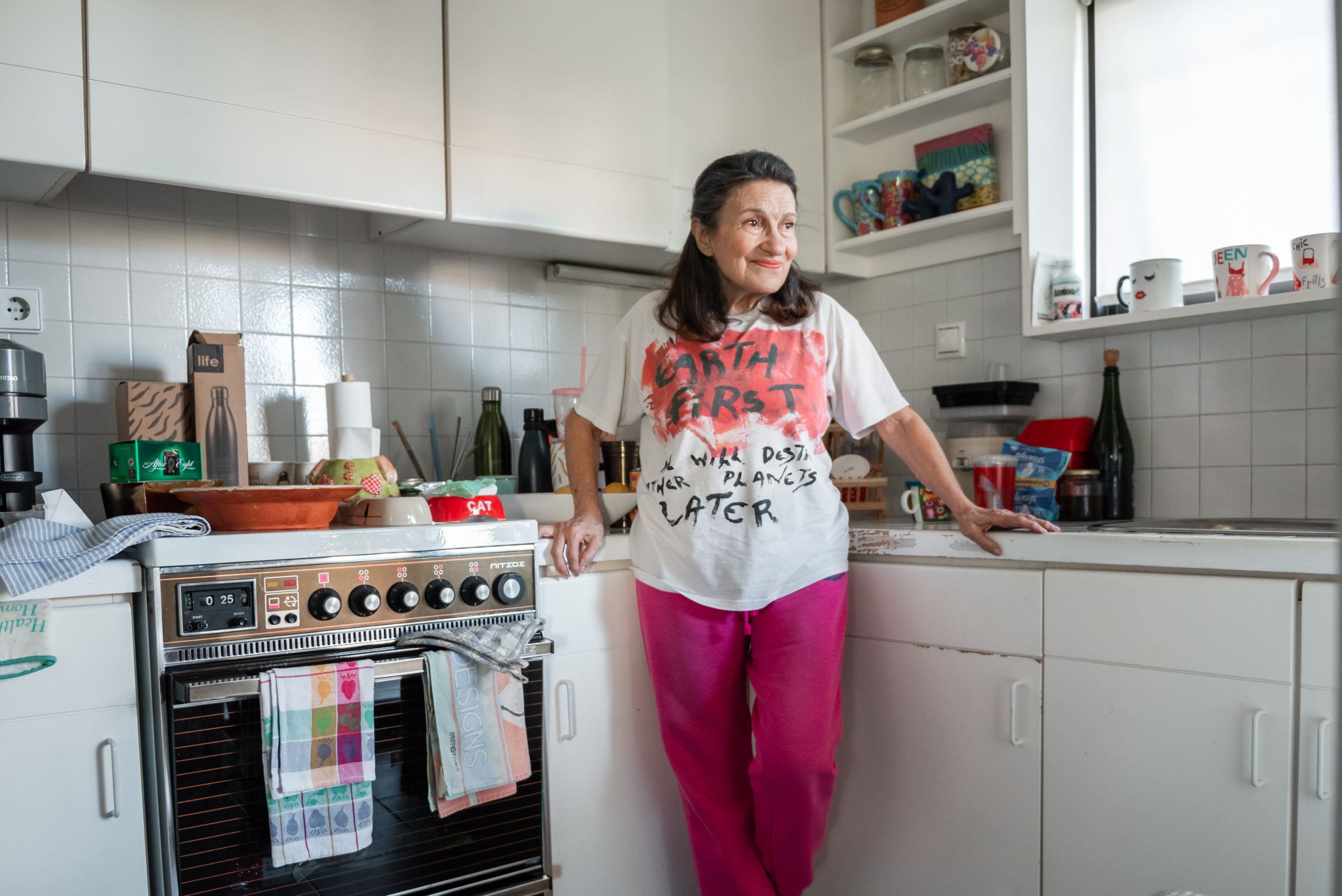 Η Ράνια Οικονομίδου στην κουζίνα του σπιτιού της με μια δήλωση ταιριαστή με τα πιστεύω της: “Planet First”.