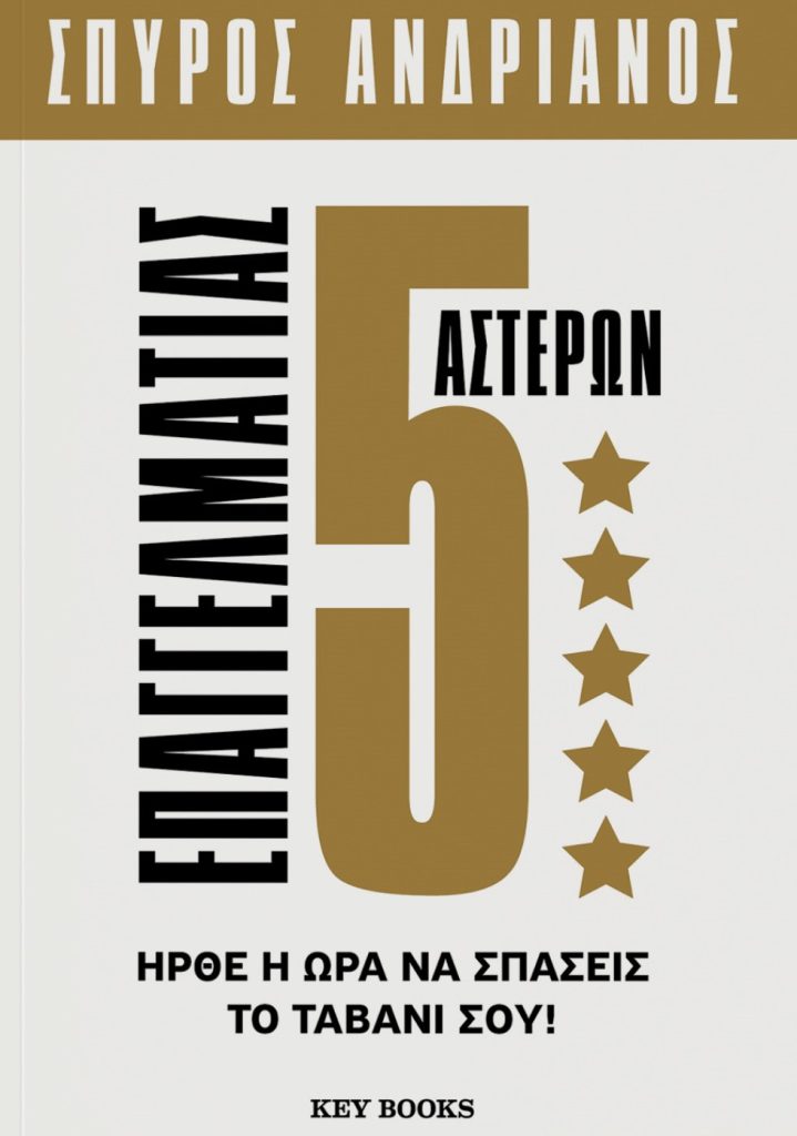 Το Επαγγελματίας 5 Αστέρων είναι εδώ για να σε ξεβολέψει, να αλλάξεις πορεία, να σπάσεις τα «αλυσίδες» που σε βουλιάζουν. Με περισσότερα από είκοσι χρόνια δραστηριότητας στον επαγγελματικό και επιχειρηματικό κόσμο, τρεις επιχειρήσεις που τις έχτισε απ’ το μηδέν και χιλιάδες ανθρώπους που τον εμπιστεύονται για να εξελιχθούν επαγγελματικά, ο Σπύρος Ανδριανός έρχεται να προσφέρει έναν πρακτικό και πλήρως εφαρμόσιμο οδηγό επαγγελματικής επιτυχίας. Μέσα από ένα καινοτόμο πλαίσιο πέντε πυλώνων, θα αξιοποιήσεις τις δυνατότητές σου, θα χτίσεις μια ανθεκτική νοοτροπία ανάπτυξης και θα κυριαρχήσεις στην αγορά. Αυτό το βιβλίο είναι γραμμένο για σένα· για σένα που είσαι μισθωτός σε μια δουλειά που δεν σου αρέσει, για σένα που είσαι αυτοαπασχολούμενος και θέλεις να αγγίξεις νέες κορυφές, για σένα που είσαι επιχειρηματίας και αναζητάς αποτελεσματικές λύσεις σε φαινομενικά άλυτα προβλήματα. Είναι ειδικά σχεδιασμένο για σένα που δεν αρκείσαι σε μία συμβατική επαγγελματική ζωή, που νιώθεις την ανάγκη να εδραιωθείς και να αφήσεις το στίγμα σου στην αγορά, βιώνοντας συγχρόνως ικανοποίηση μέσα στην εργασιακή σου καθημερινότητα. Είσαι έτοιμος να αποδεχτείς τη δύναμη των αποφάσεών σου και να μάθεις να χτίζεις την επιτυχία από μέσα;