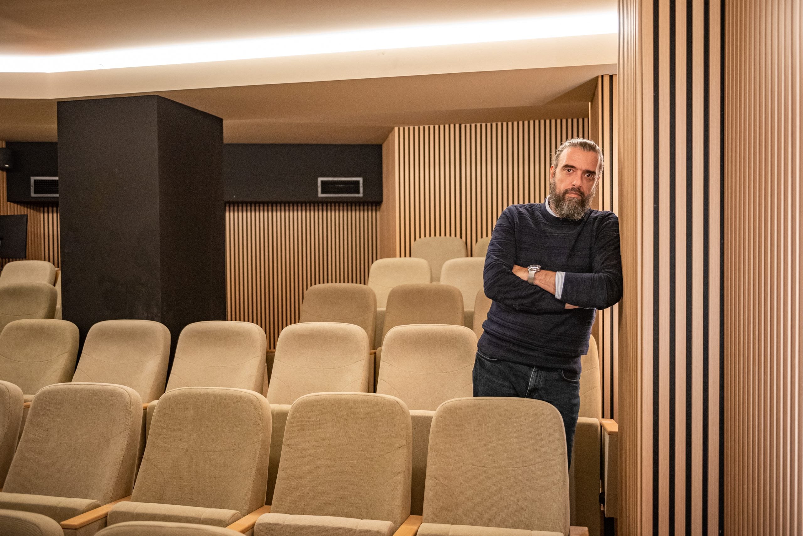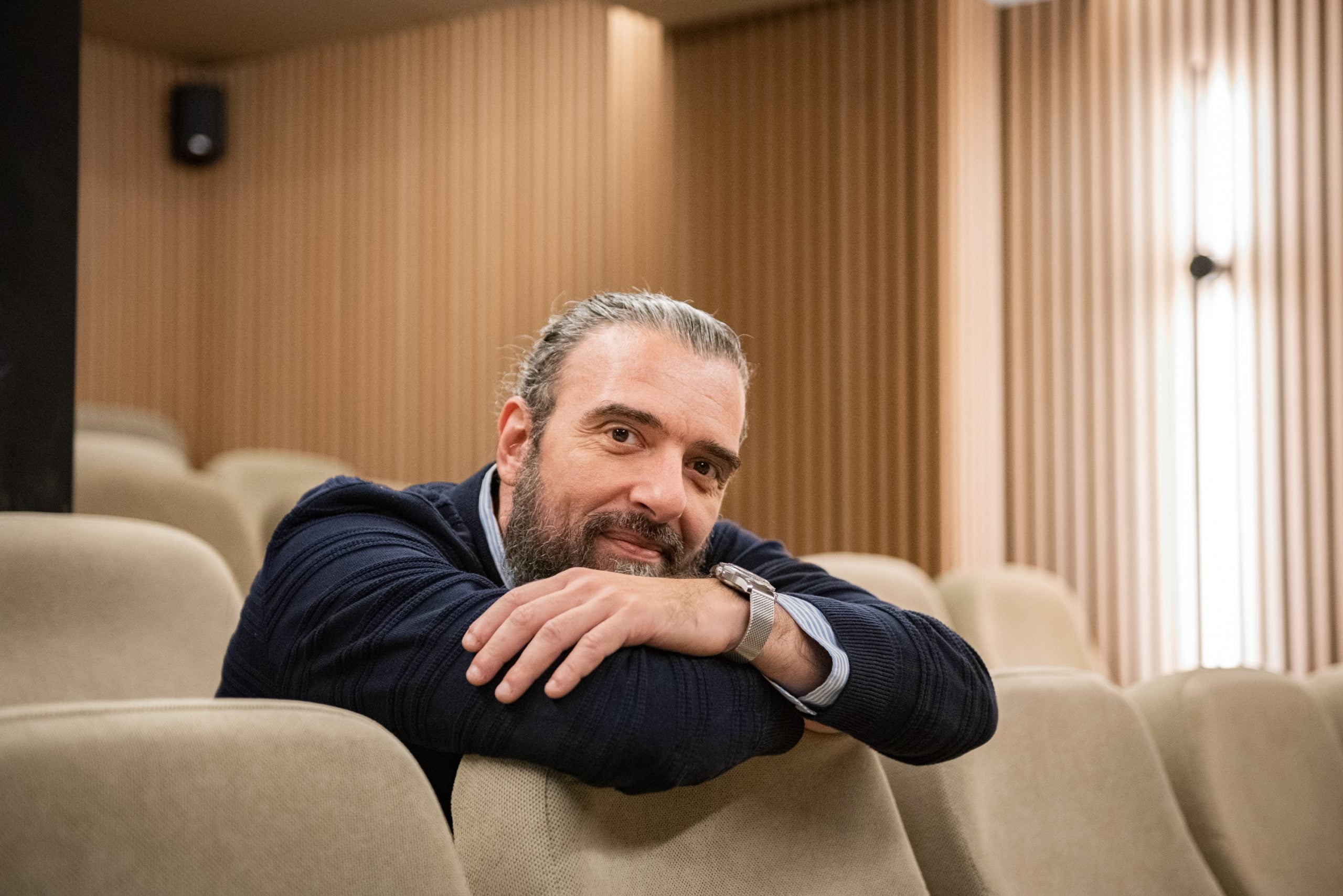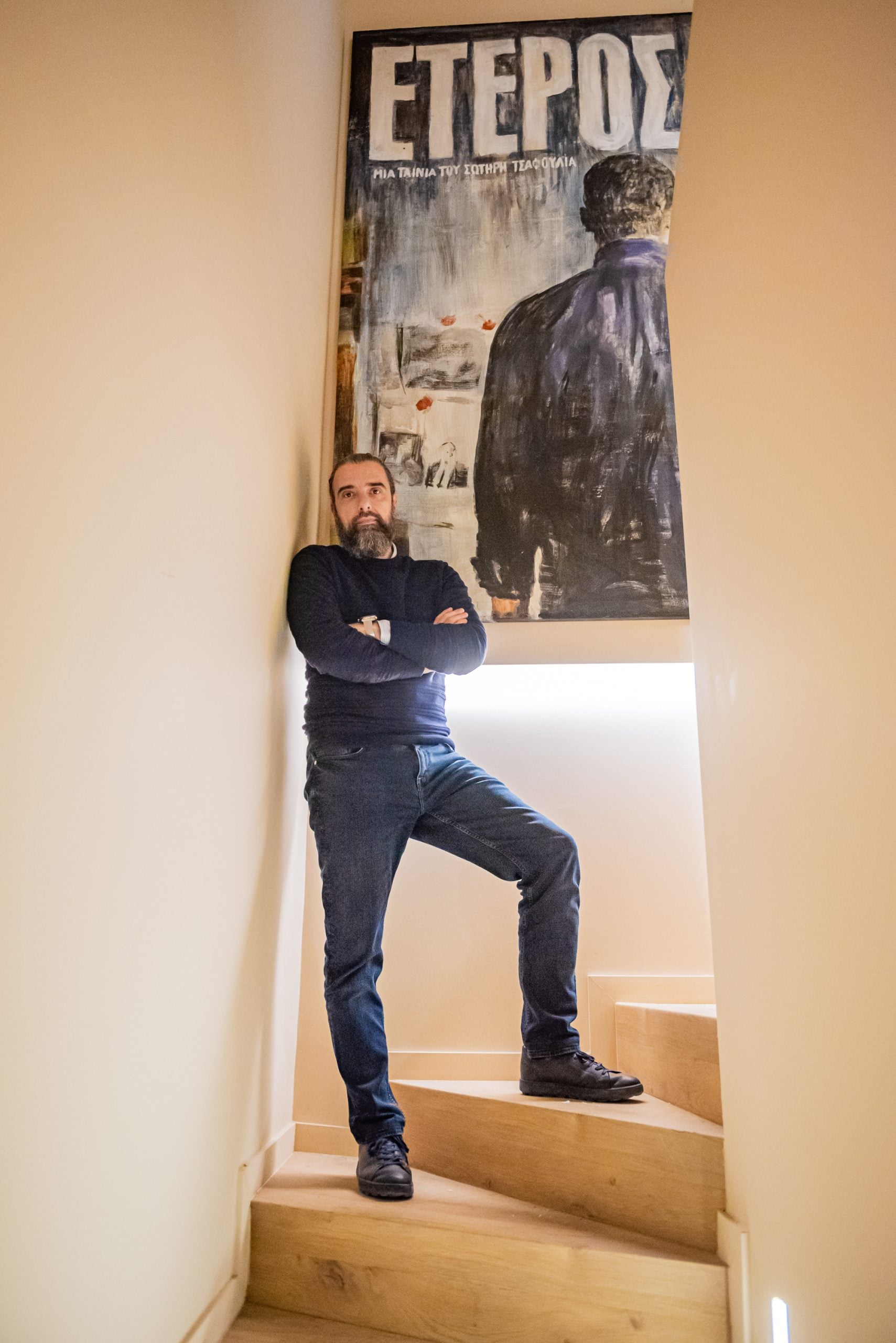 Ο ήχος από ξύλο που κόβεται και οι νότες από ένα πιάνο που κουρδίζεται ανακατεύονται με έναν, περίεργα, ενδιαφέροντα τρόπο. Περνώντας προσεκτικά από δωμάτια υπό κατασκευή που μυρίζουν «καινούργιο», αφήνοντας πίσω μια κάθετη γιγαντοαφίσα του «Έτερος εγώ» φτάνω σε ένα meeting room – βιβλιοθήκη, γεμάτη από σκληρόδετες αφιερωματικές εκδόσεις για τον Πέδρο Αλμοδόβαρ, τον Μάρτιν Σκορσέζε, τον Γιώργο Λάνθιμο.