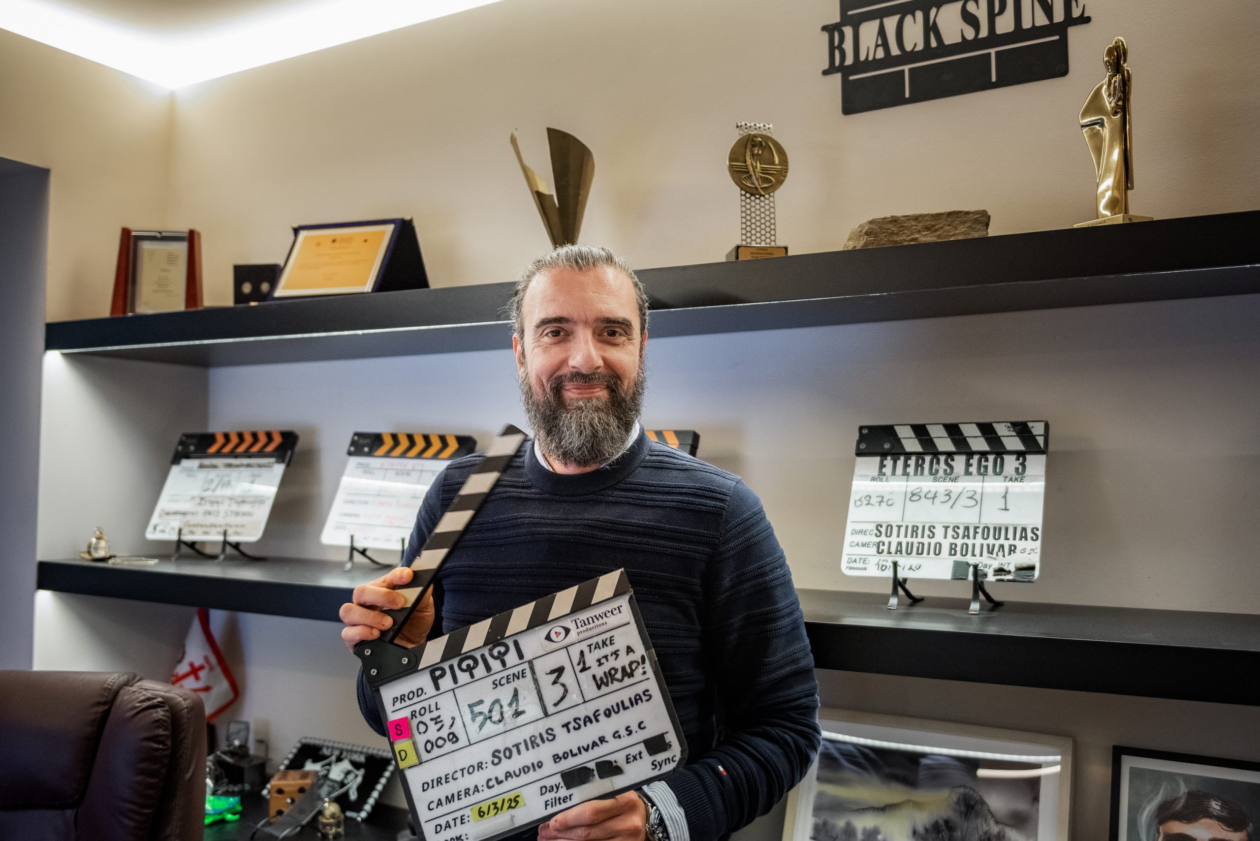 Ο ήχος από ξύλο που κόβεται και οι νότες από ένα πιάνο που κουρδίζεται ανακατεύονται με έναν, περίεργα, ενδιαφέροντα τρόπο. Περνώντας προσεκτικά από δωμάτια υπό κατασκευή που μυρίζουν «καινούργιο», αφήνοντας πίσω μια κάθετη γιγαντοαφίσα του «Έτερος εγώ» φτάνω σε ένα meeting room – βιβλιοθήκη, γεμάτη από σκληρόδετες αφιερωματικές εκδόσεις για τον Πέδρο Αλμοδόβαρ, τον Μάρτιν Σκορσέζε, τον Γιώργο Λάνθιμο.