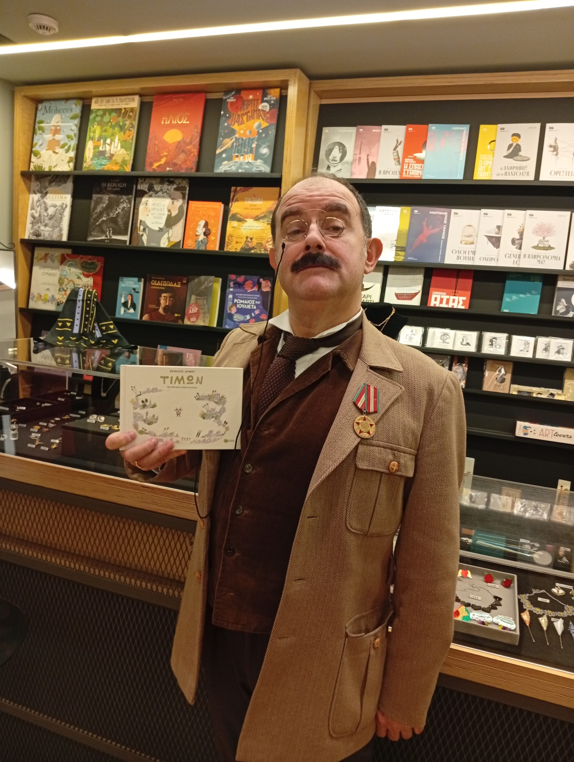 Αναποφάσιστος: με το κοστούμι του Κουλίγκιν από τις “Τρεις αδερφές” του Εθνικού Θεάτρου και το νέο του βιβλίο ανά χείρας.