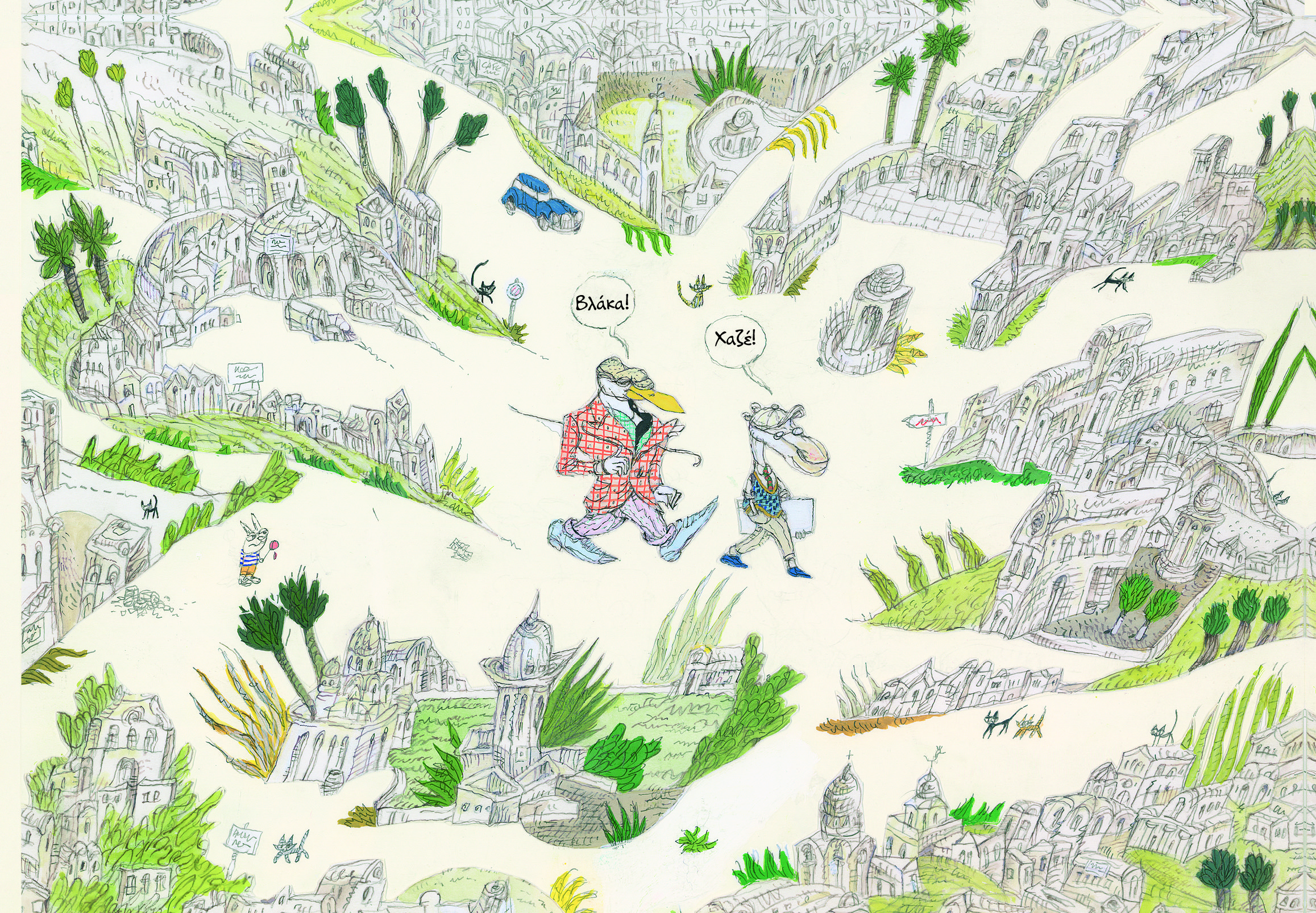 Το ύφος της Βυζαντινής μικρογραφίας διατρέχει την σκιτσογραγική αντίληψη του Δήμου για την αποτύπωση της πόλης.