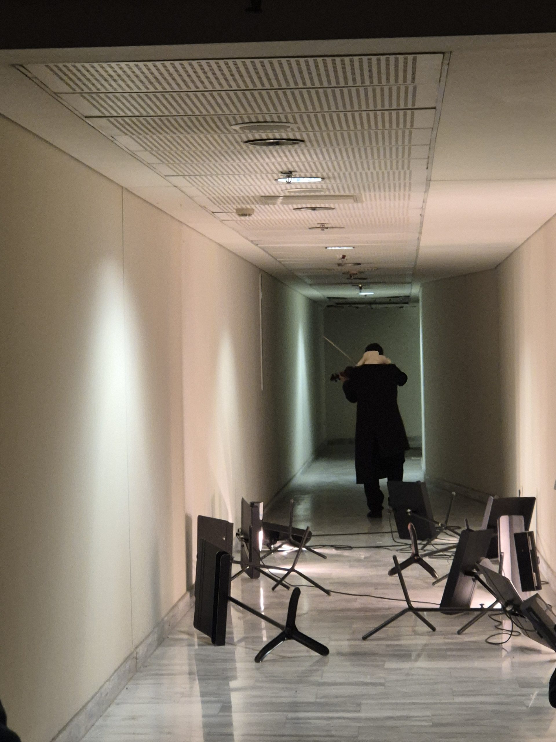 Συνεχίζουμε την πορεία μας προς έναν κρυφό διάδρομο, όπου μας υποδέχεται απομακρυνόμενος ένας βιολιστής σε μια ατμοσφαιρική κινηματογραφική φόρμα, ενώ λίγο πιο πέρα δύο μουσικοί παίζουν για εμάς βιολί και σαξόφωνο, με την πλάτη σε εμάς με δίπλα τους μισοσκεπασμένες οθόνες με διαλόγους Δρίβα και ΤΝ. Μικρά αποφθέγματα, όπως: «Ο δρόμος του ήχου μπορεί να είναι στρωμένος με νεκρές συχνότητες». Όπως μου εξηγεί ο Δρίβας, «Στα μόνιτορ, έχω κρατήσει 6 χαϊκού, σαν αποστάγματα, μέσα από chat 100 σελίδων κυριολεκτικά. Τα απομόνωσα γιατί τα θεωρώ μίνι φιλοσοφικά δοκίμια σε μια πρόταση».