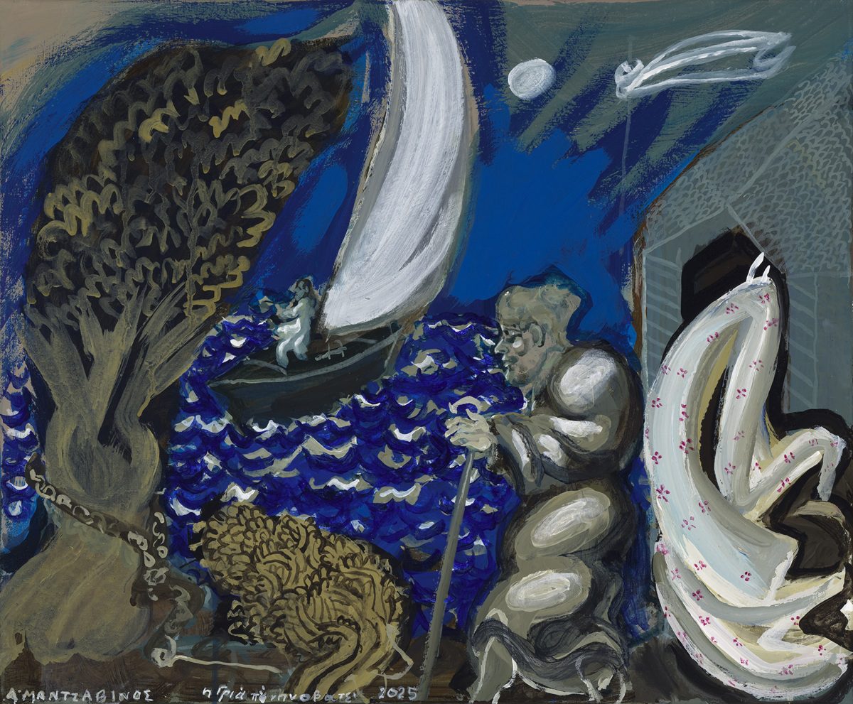 Ο Τάσος Μαντζαβίνος επιστρέφει στη γενέθλια ακτή του Φαλήρου. Δεν είναι τόπος μνήμης με τη στενή, βιογραφική έννοια, αλλά εσωτερικό τοπίο που δεν έπαψε ποτέ να τον συγκροτεί. Η προσωπική ιστορία του ζωγράφου εγγράφεται σιωπηλά σε αυτή τη σχέση. Οι γνώριμες πια φιγούρες του Μαντζαβίνου συνθέτουν ένα υδάτινο σύμπαν, μέσα στο οποίο στέκουν μέσα στο νερό όπως στέκεται κανείς μπροστά σε κάτι που τον ξεπερνά. Φωτογραφίες, αντικείμενα και εργαλεία της μαστορικής του ζωγράφου ταξιδεύουν τον επισκέπτη στον χρόνο όπου ο Μαντζαβίνος ανοίγεται στη σκοτεινή του θάλασσα.