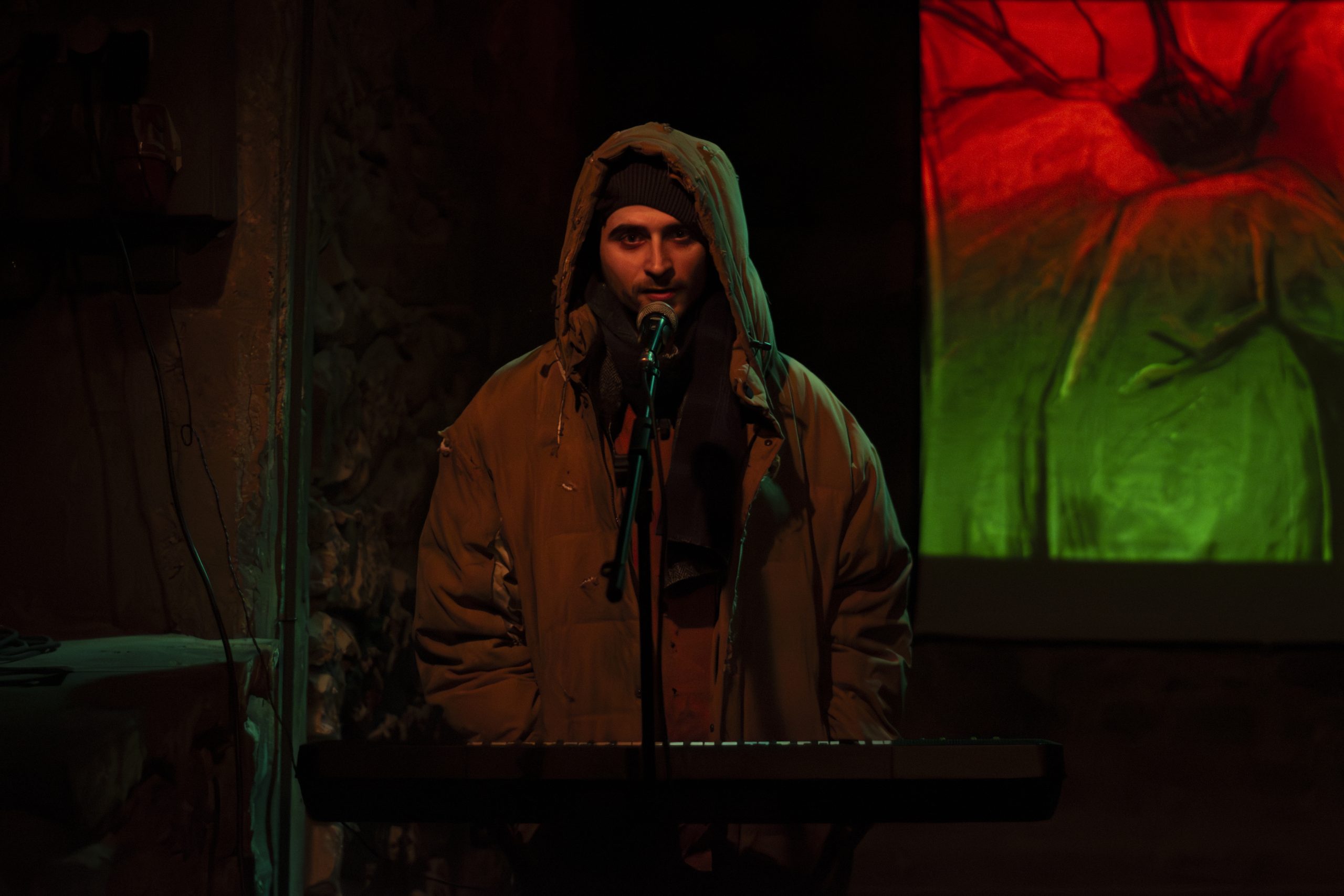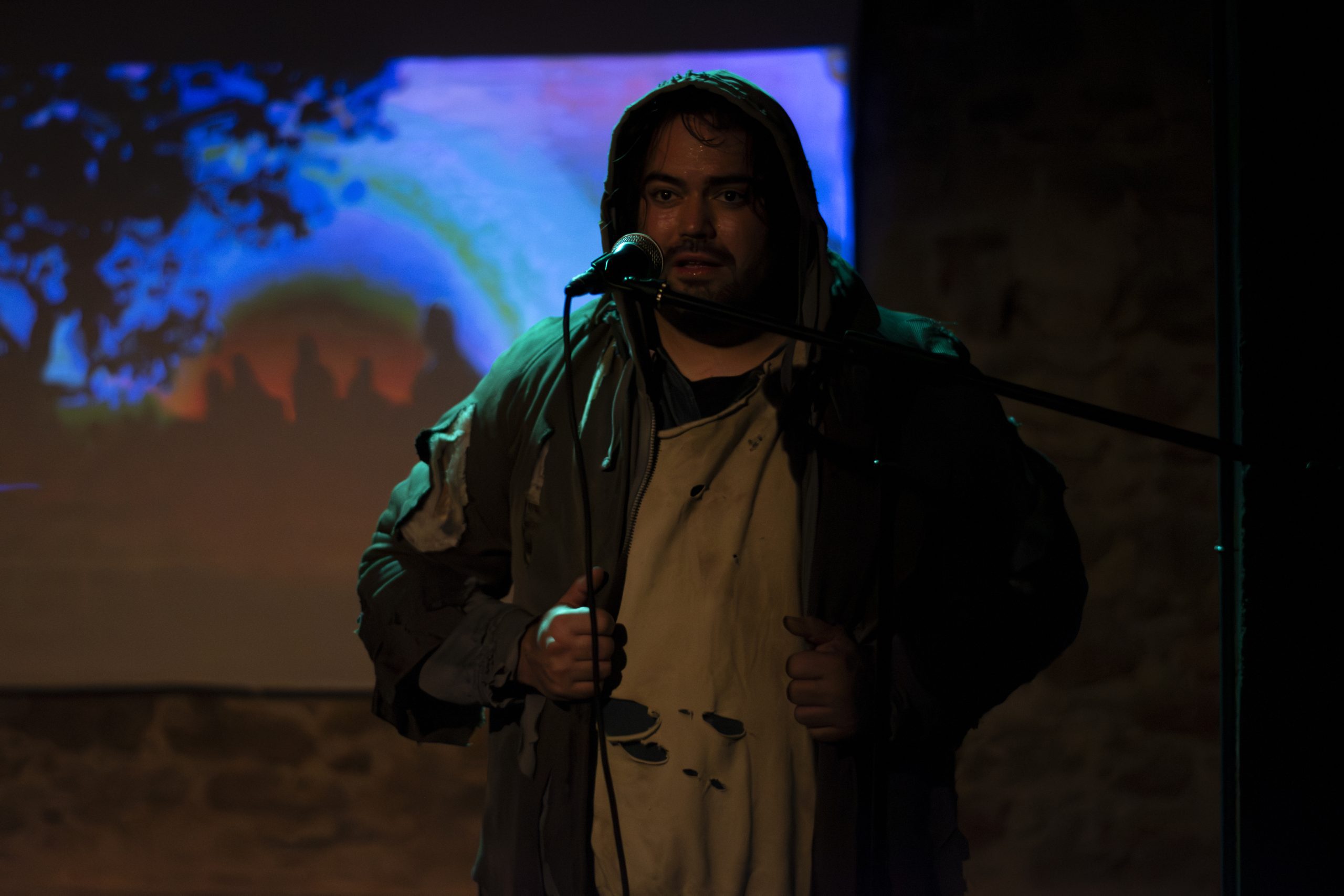 Στο βάθος της μικρής σκηνής, που βρίσκεται στο ίδιο επίπεδο μαζί σου, ένα πανί στον τοίχο προβάλλει εικόνες με αισθητική κόμικ και animation, που δεν εικονογραφούν απλώς την πλοκή, αλλά συνομιλούν διαρκώς μαζί της. Μπροστά του οι δύο ηθοποιοί (Αλέξανδρος Μιχαηλίδης και Βασίλης Πέτρου) – με μικρόφωνα και τα διαφορετικά μουσικά όργανά τους – ερμηνεύουν και αφηγούνται, ενώ ο μουσικός Κώστας Νικολόπουλος στο πλάι δημιουργεί ζωντανά τον ηχητικό κόσμο της παράστασης: ρυθμούς, υφές και ηχητικά τοπία που αγκαλιάζουν τον λόγο και την εικόνα. Θέατρο, μουσική και video art συνυπάρχουν ισότιμα, σχηματίζοντας μια ενιαία παρτιτούρα.