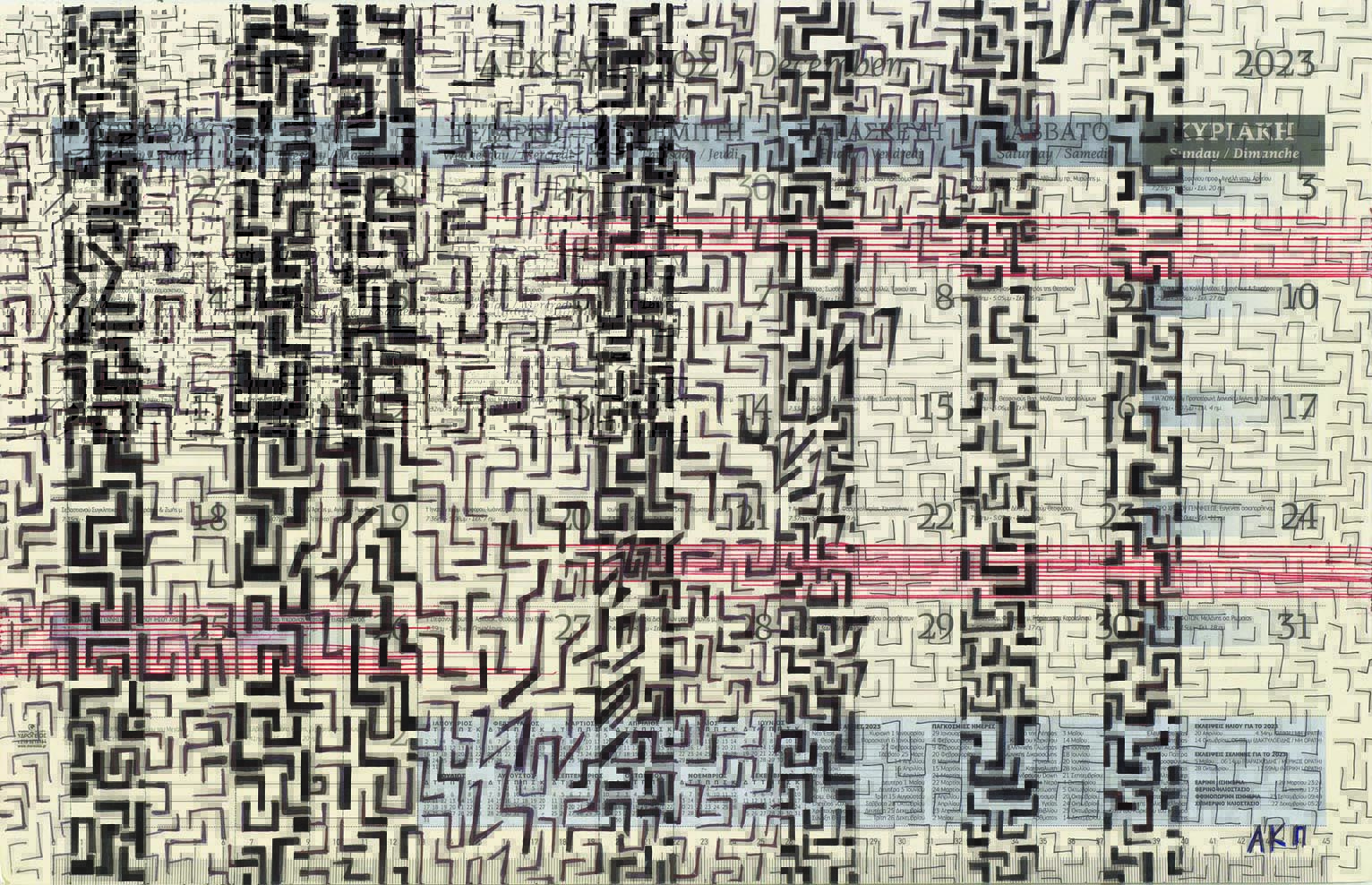 Bilingue (Δίγλωσσο), 2023. Στιλό διαρκείας σε ημερολόγιο μηνιαίου πλάνου
